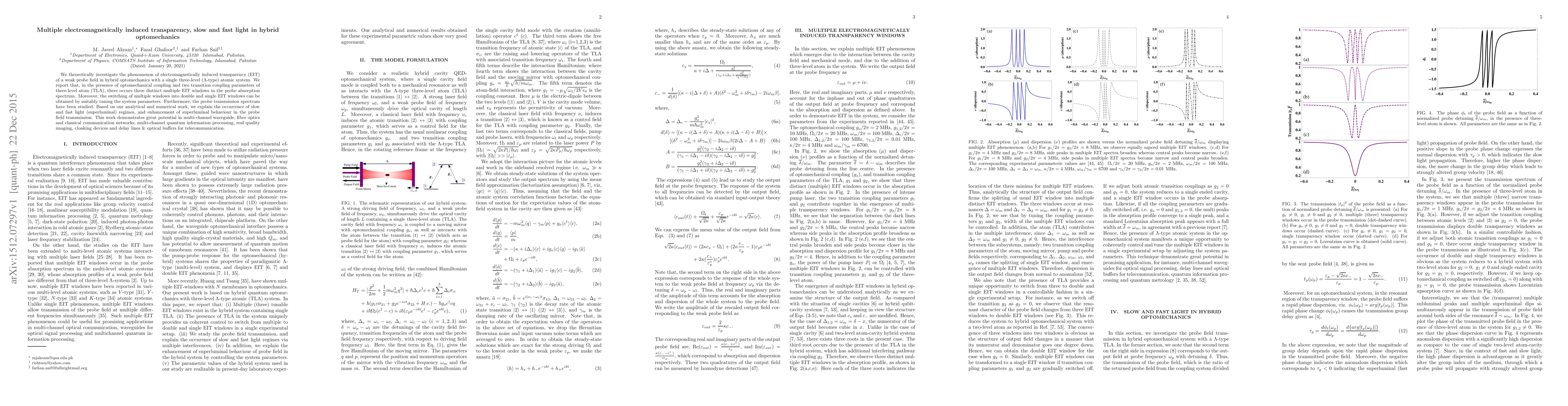 This paper theoretically explores multiple electromagnetically induced transparency (EIT) windows in hybrid optomechanics involving a three-level atomic system, showing how optomechanical coupling and transition coupling parameters can manipulate these windows. The study also investigates slow and fast light regimes in probe field transmission, with potential applications in communication networks, quantum information processing, and optical devices.
