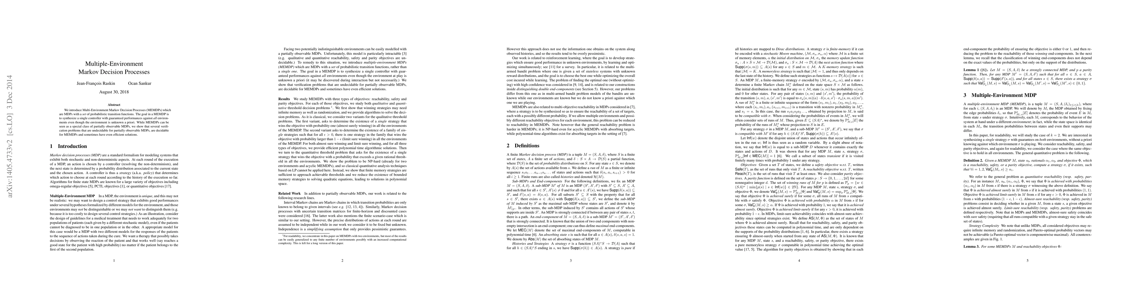 This paper introduces Multi-Environment Markov Decision Processes (MEMDPs), a type of MDP with probabilistic transition functions, aiming to synthesize a controller that guarantees performance across unknown environments. Unlike partially observable MDPs, MEMDPs allow for decidability and efficient solutions for certain verification problems.