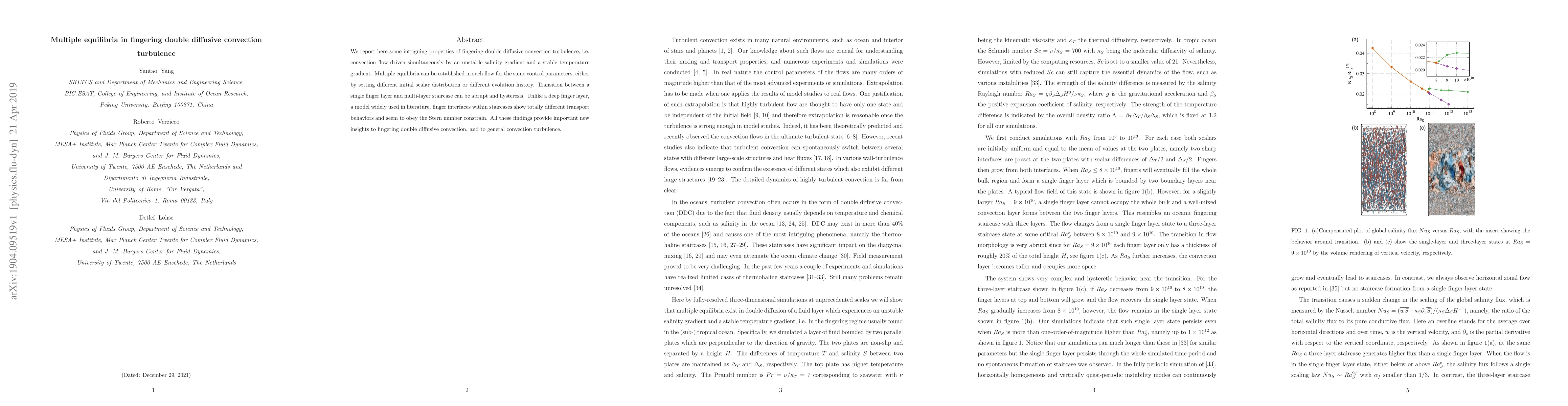 This paper investigates fingering double diffusive convection turbulence, revealing multiple equilibria for the same control parameters due to different initial conditions or evolution histories. It highlights abrupt transitions between single-finger and multi-layer staircase patterns, with distinct transport behaviors in staircases compared to deep finger layers.
