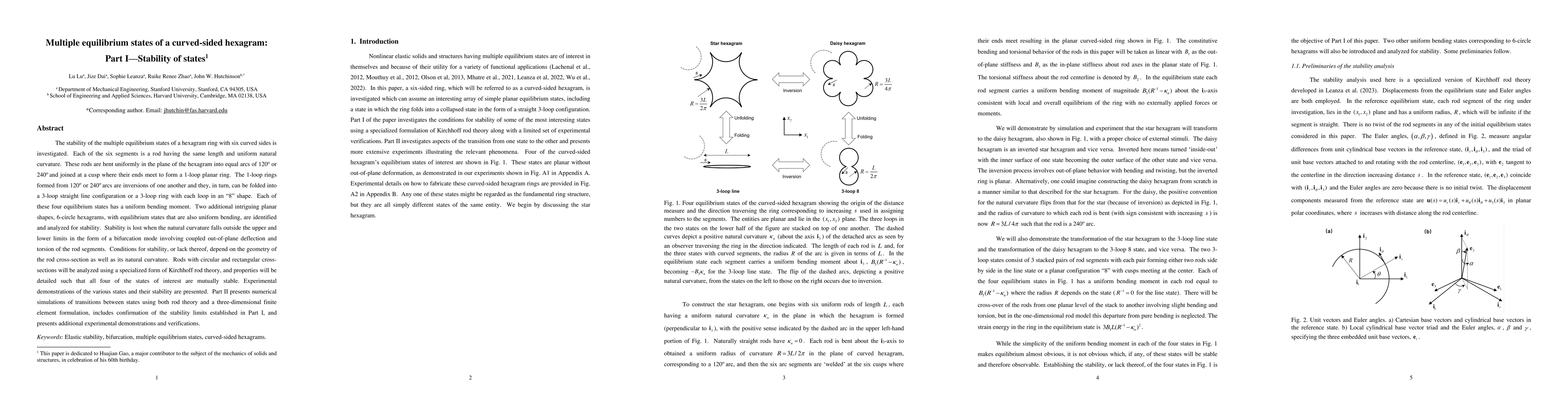 The stability of the multiple equilibrium states of a hexagram ring with six curved sides is investigated. Each of the six segments is a rod having the same length and uniform natural curvature. These rods are bent uniformly in the plane of the hexagram into equal arcs of 120deg or 240deg and joined at a cusp where their ends meet to form a 1-loop planar ring. The 1-loop rings formed from 120deg or 240deg arcs are inversions of one another and they, in turn, can be folded into a 3-loop straight line configuration or a 3-loop ring with each loop in an "8" shape. Each of these four equilibrium states has a uniform bending moment. Two additional intriguing planar shapes, 6-circle hexagrams, with equilibrium states that are also uniform bending, are identified and analyzed for stability. Stability is lost when the natural curvature falls outside the upper and lower limits in the form of a bifurcation mode involving coupled out-of-plane deflection and torsion of the rod segments. Conditions for stability, or lack thereof, depend on the geometry of the rod cross-section as well as its natural curvature. Rods with circular and rectangular cross-sections will be analyzed using a specialized form of Kirchhoff rod theory, and properties will be detailed such that all four of the states of interest are mutually stable. Experimental demonstrations of the various states and their stability are presented. Part II presents numerical simulations of transitions between states using both rod theory and a three-dimensional finite element formulation, includes confirmation of the stability limits established in Part I, and presents additional experimental demonstrations and verifications.