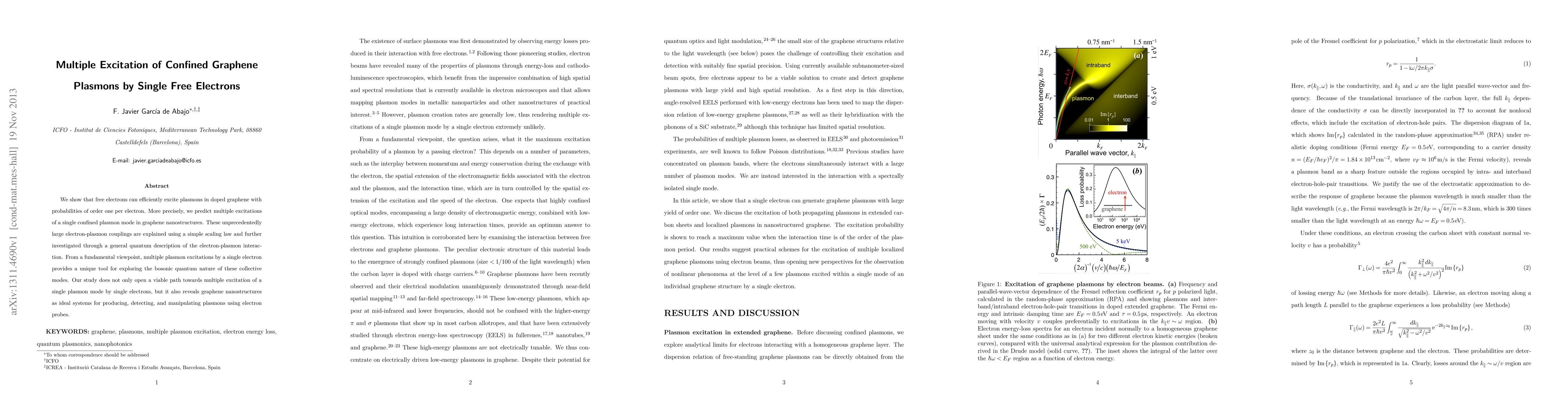 The paper presents a powerful electrostatic scaling law and a quantum-mechanical model for describing multiple excitations of graphene plasmons by fast electrons, providing a bridge between classical and quantum descriptions.