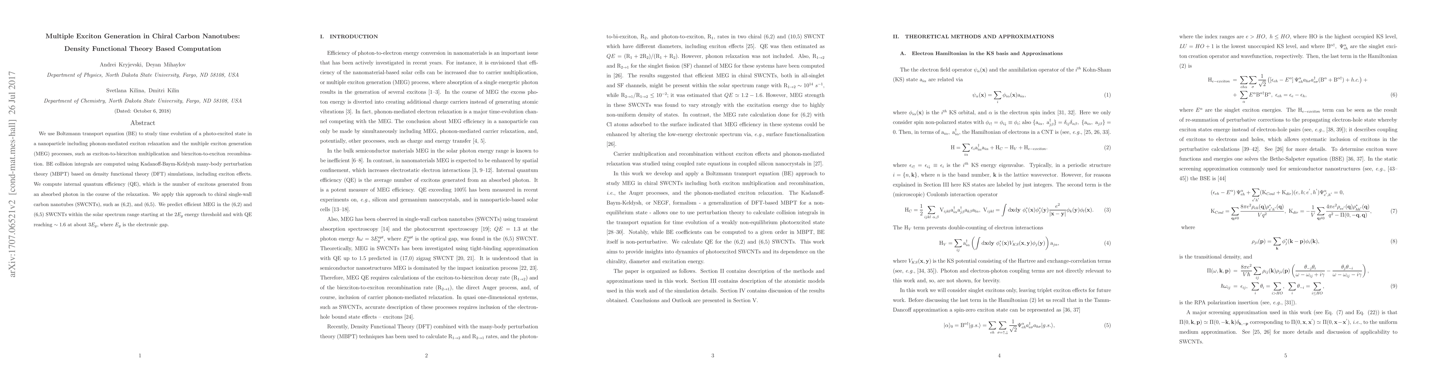 This study employs density functional theory to investigate multiple exciton generation in chiral carbon nanotubes using the Boltzmann transport equation, predicting efficient MEG in (6,2) and (6,5) SWCNTs with internal quantum efficiency reaching up to 1.6 within the solar spectrum range.