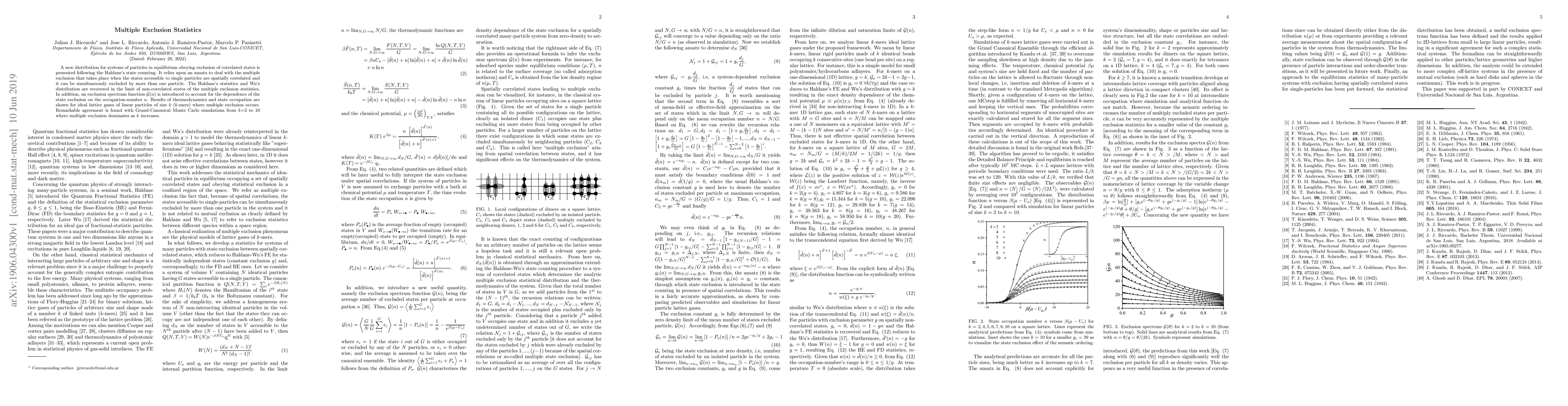 A new distribution for systems of particles in equilibrium obeying exclusion of correlated states is presented following the Haldane's state counting. It relies upon an ansatz to deal with the multiple exclusion that takes place when the states accessible to single particles are spatially correlated and it can be simultaneously excluded by more than one particle. The Haldane's statistics and Wu's distribution are recovered in the limit of non-correlated states of the multiple exclusion statistics. In addition, an exclusion spectrum function $\mathcal{G}(n)$ is introduced to account for the dependence of the state exclusion on the occupation-number $n$. Results of thermodynamics and state occupation are shown for ideal lattice gases of linear particles of size $k$ ($k$-mers) where multiple exclusion occurs. Remarkable agreement is found with Grand-Canonical Monte Carlo simulations from $k$=2 to 10 where multiple exclusion dominates as $k$ increases.