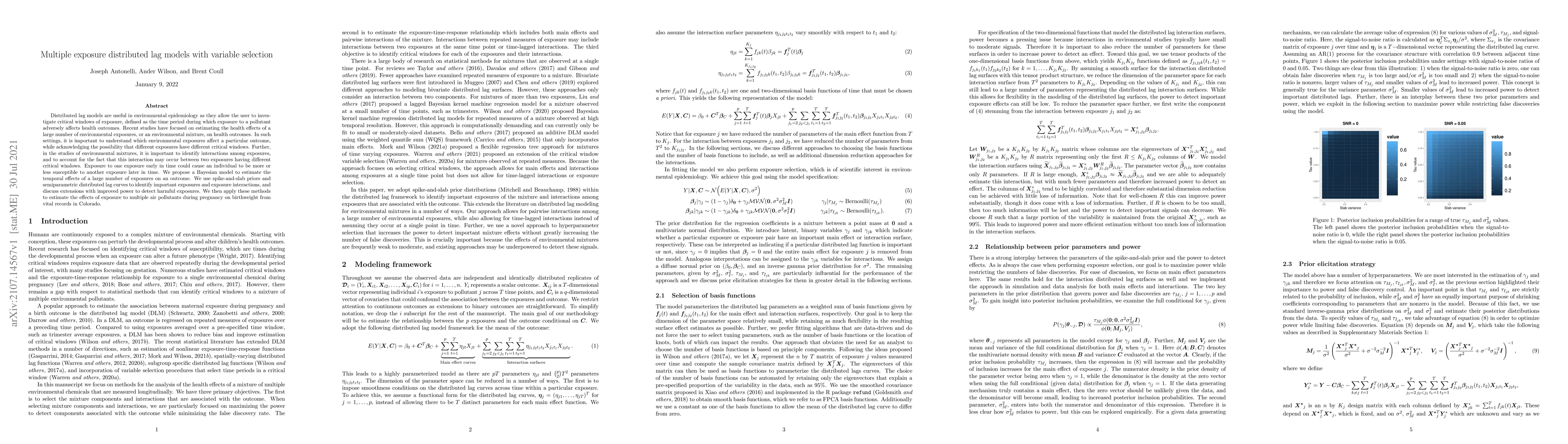 This paper proposes a Bayesian model with spike-and-slab priors and semiparametric distributed lag curves to identify critical windows and interactions of multiple environmental exposures affecting health outcomes. The method is applied to estimate the impact of various air pollutants on birthweight in Colorado.