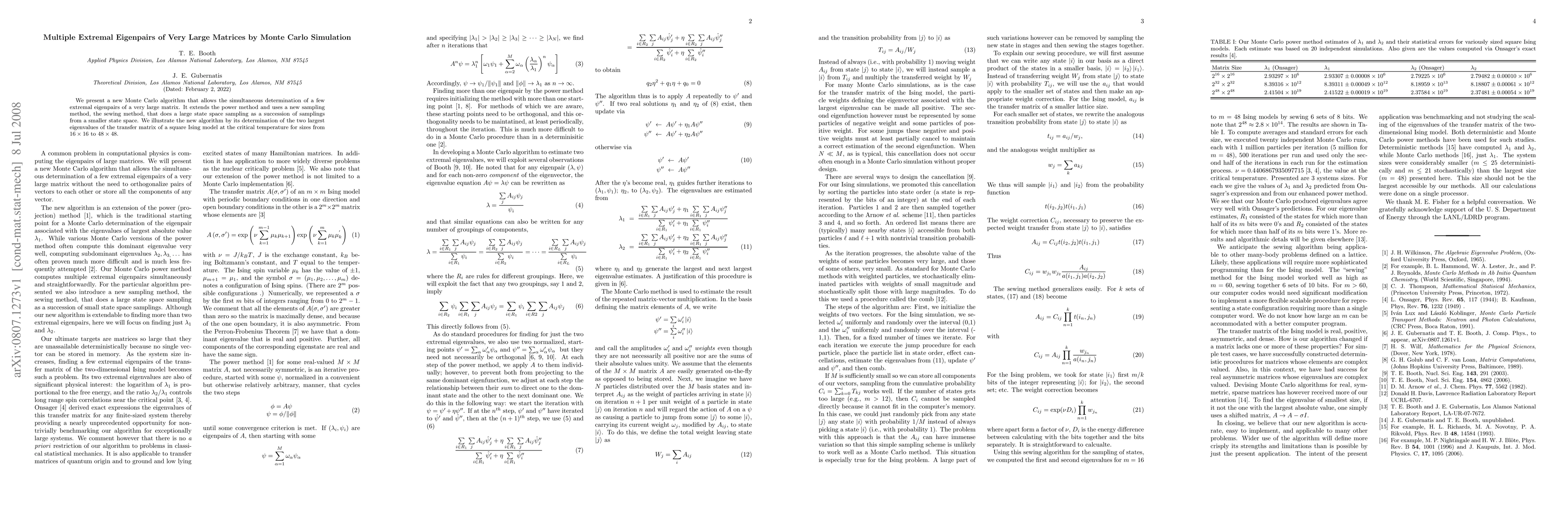 This paper introduces a novel Monte Carlo algorithm for identifying multiple extremal eigenpairs in massive matrices, employing a sewing sampling method. It's demonstrated by accurately calculating the two largest eigenvalues of large Ising model transfer matrices from 16x16 to 48x48.