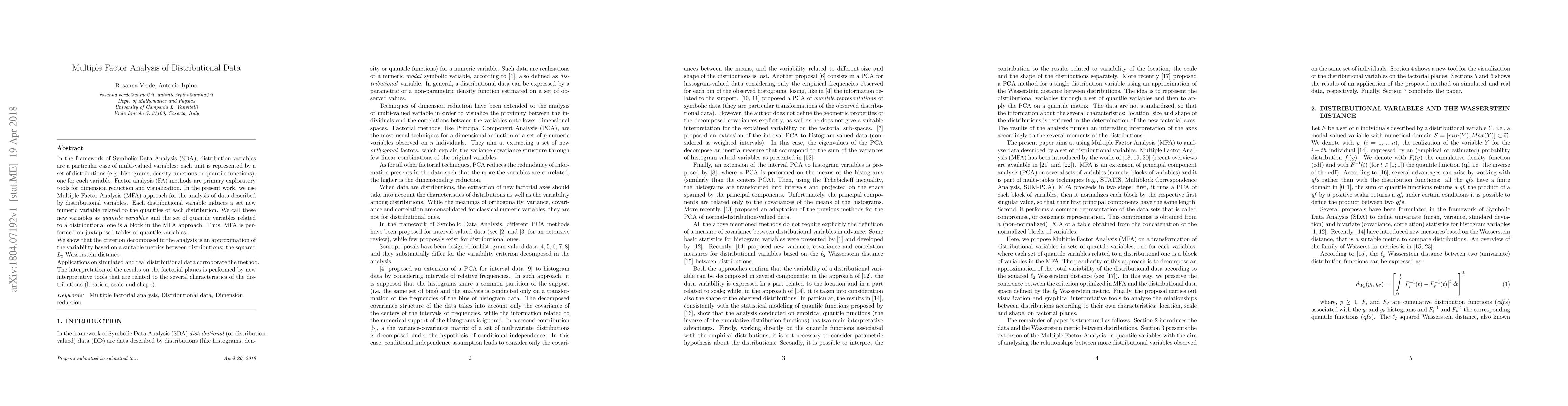 This paper uses Multiple Factor Analysis to analyze data described by distributional variables, transforming them into quantile variables for dimension reduction and visualization. The method approximates variability based on a squared L2 Wasserstein distance metric and is applied to simulated and real data with promising results.