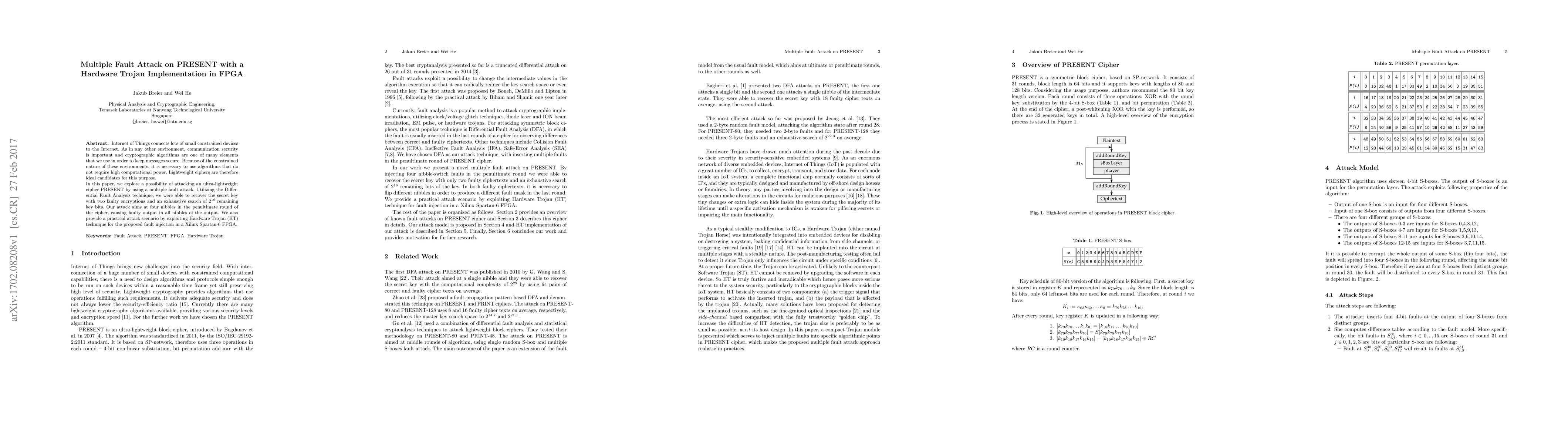 Internet of Things connects lots of small constrained devices to the Internet. As in any other environment, communication security is important and cryptographic algorithms are one of many elements that we use in order to keep messages secure. Because of the constrained nature of these environments, it is necessary to use algorithms that do not require high computational power. Lightweight ciphers are therefore ideal candidates for this purpose. In this paper, we explore a possibility of attacking an ultra-lightweight cipher PRESENT by using a multiple fault attack. Utilizing the Differential Fault Analysis technique, we were able to recover the secret key with two faulty encryptions and an exhaustive search of 2^16 remaining key bits. Our attack aims at four nibbles in the penultimate round of the cipher, causing faulty output in all nibbles of the output. We also provide a practical attack scenario by exploiting Hardware Trojan (HT) technique for the proposed fault injection in a Xilinx Spartan-6 FPGA.