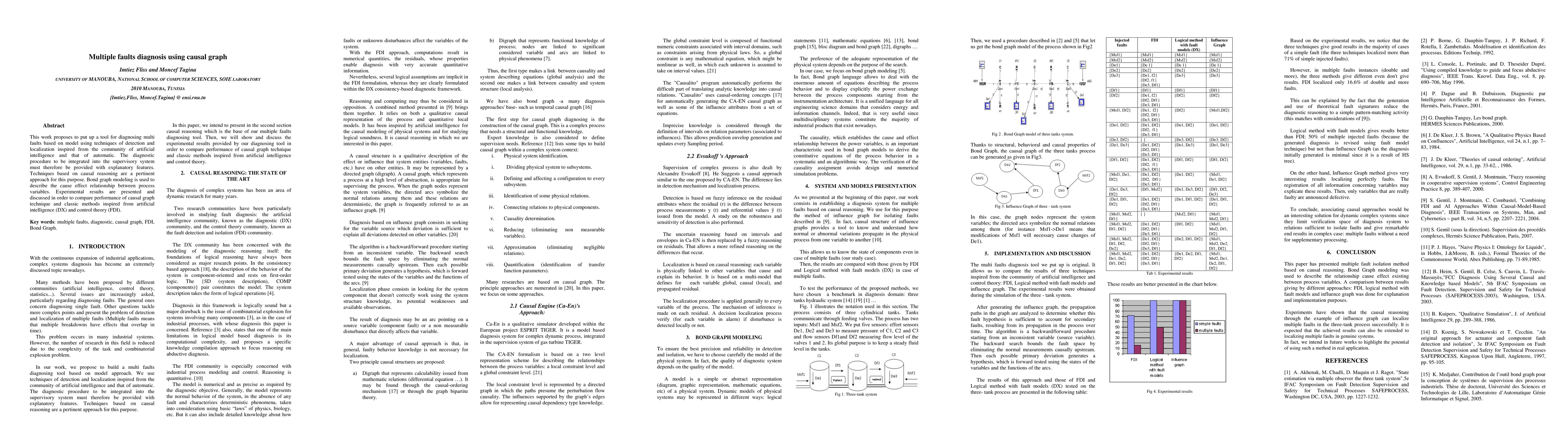 This work proposes to put up a tool for diagnosing multi faults based on model using techniques of detection and localization inspired from the community of artificial intelligence and that of automatic. The diagnostic procedure to be integrated into the supervisory system must therefore be provided with explanatory features. Techniques based on causal reasoning are a pertinent approach for this purpose. Bond graph modeling is used to describe the cause effect relationship between process variables. Experimental results are presented and discussed in order to compare performance of causal graph technique and classic methods inspired from artificial intelligence (DX) and control theory (FDI).