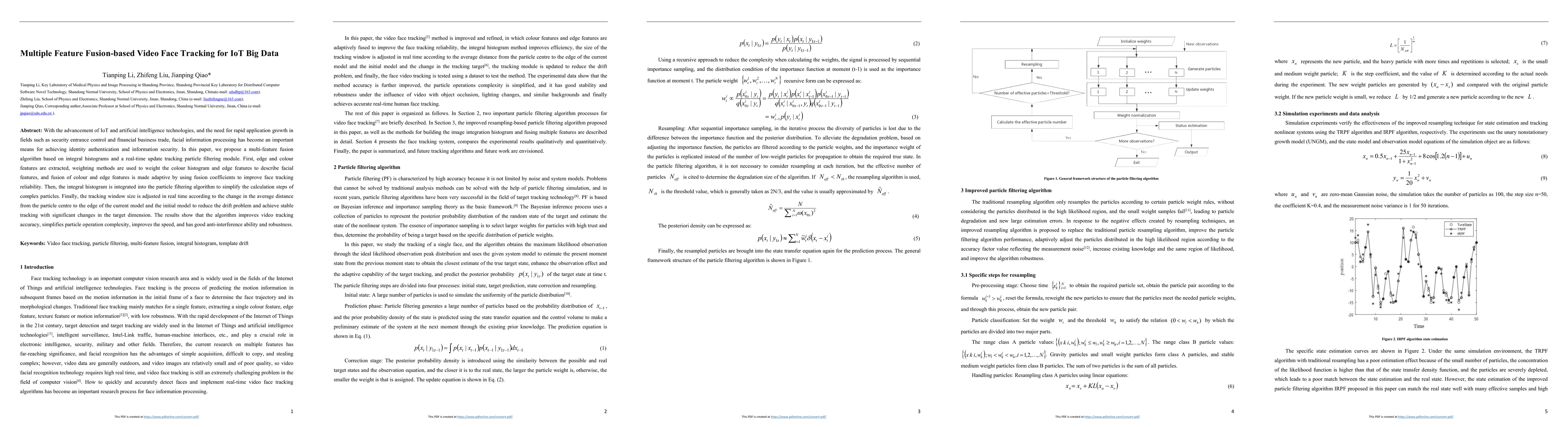 With the advancement of IoT and artificial intelligence technologies, and the need for rapid application growth in fields such as security entrance control and financial business trade, facial information processing has become an important means for achieving identity authentication and information security. In this paper, we propose a multi-feature fusion algorithm based on integral histograms and a real-time update tracking particle filtering module. First, edge and colour features are extracted, weighting methods are used to weight the colour histogram and edge features to describe facial features, and fusion of colour and edge features is made adaptive by using fusion coefficients to improve face tracking reliability. Then, the integral histogram is integrated into the particle filtering algorithm to simplify the calculation steps of complex particles. Finally, the tracking window size is adjusted in real time according to the change in the average distance from the particle centre to the edge of the current model and the initial model to reduce the drift problem and achieve stable tracking with significant changes in the target dimension. The results show that the algorithm improves video tracking accuracy, simplifies particle operation complexity, improves the speed, and has good anti-interference ability and robustness.