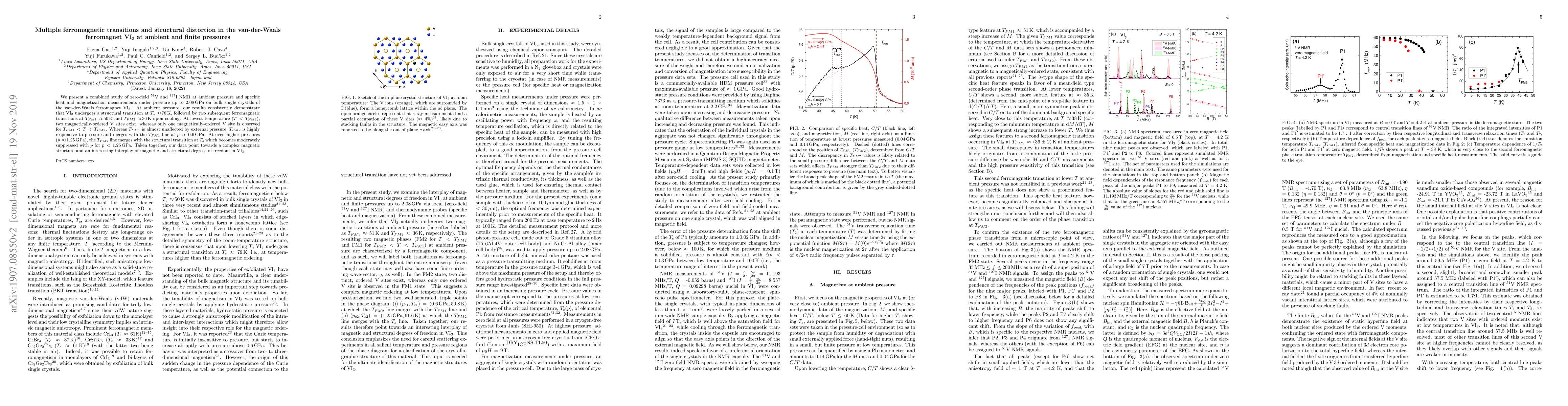 We present a combined study of zero-field $^{51}$V and $^{127}$I NMR at ambient pressure and specific heat and magnetization measurements under pressure up to 2.08 GPa on bulk single crystals of the van-der-Waals ferromagnet VI$_3$. At ambient pressure, our results consistently demonstrate that VI$_3$ undergoes a structural transition at $T_s \approx $78 K, followed by two subsequent ferromagnetic transitions at $T_{FM1} \approx $50 K and $T_{FM2} \approx $36 K upon cooling. At lowest temperature ($T < T_{FM2}$), two magnetically-ordered V sites exist, whereas only one magnetically-ordered V site is observed for $T_{FM1} < T\,< T_{FM2}$. Whereas $T_{FM1}$ is almost unaffected by external pressure, $T_{FM2}$ is highly responsive to pressure and merges with the $T_{FM1}$ line at $p \approx 0.6 $GPa. At even higher pressures ($p \approx $1.25\,GPa), the $T_{FM2}$ line merges with the structural transition at $T_s$ which becomes moderately suppressed with $p$ for $p < 1.25$ GPa. Taken together, our data point towards a complex magnetic structure and an interesting interplay of magnetic and structural degrees of freedom in VI$_3$.