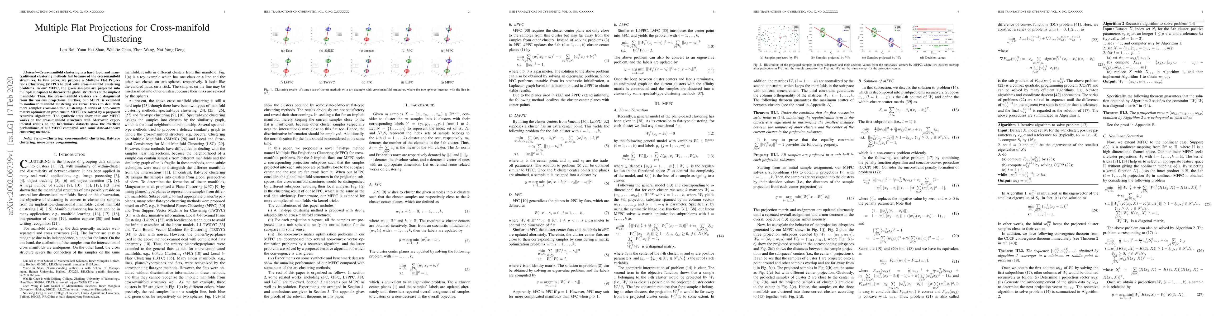 This paper introduces Multiple Flat Projections Clustering (MFPC) to tackle cross-manifold clustering issues, where traditional methods often falter. MFPC projects samples into multiple subspaces to uncover global manifold structures, distinguishing cross-manifold clusters. The method is extended to nonlinear manifolds using kernel tricks and optimized via a recursive algorithm. Synthetic tests and benchmark dataset experiments demonstrate MFPC's effectiveness in handling complex cross-manifold structures, outperforming existing clustering methods.