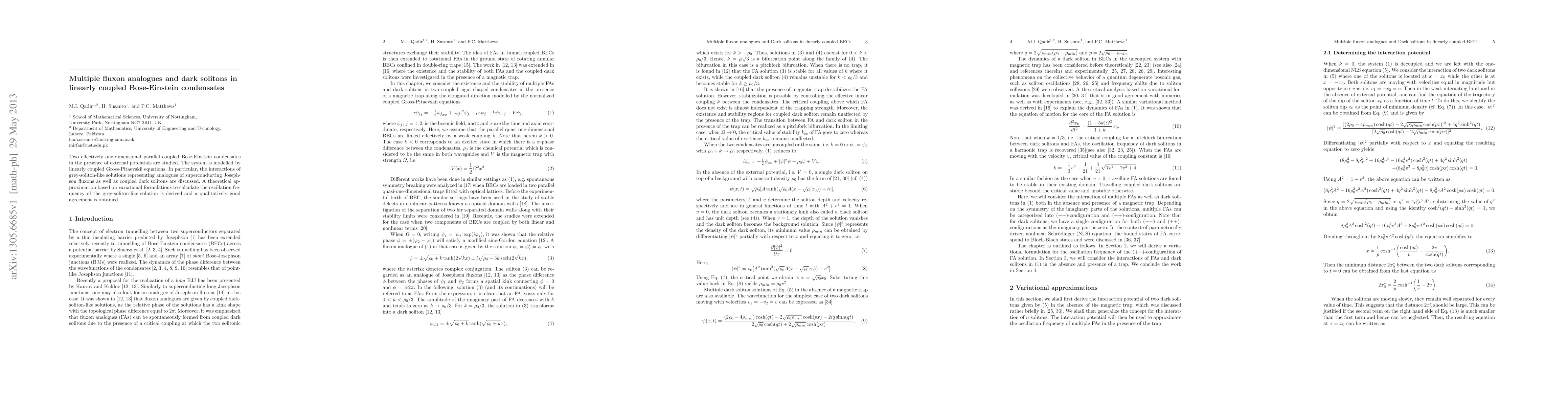 This paper investigates the dynamics of coupled Bose-Einstein condensates using linearly coupled Gross-Pitaevskii equations, focusing on grey-soliton analogues of Josephson fluxons and coupled dark solitons, and derives a variational approximation to determine the oscillation frequency with good theoretical accuracy.