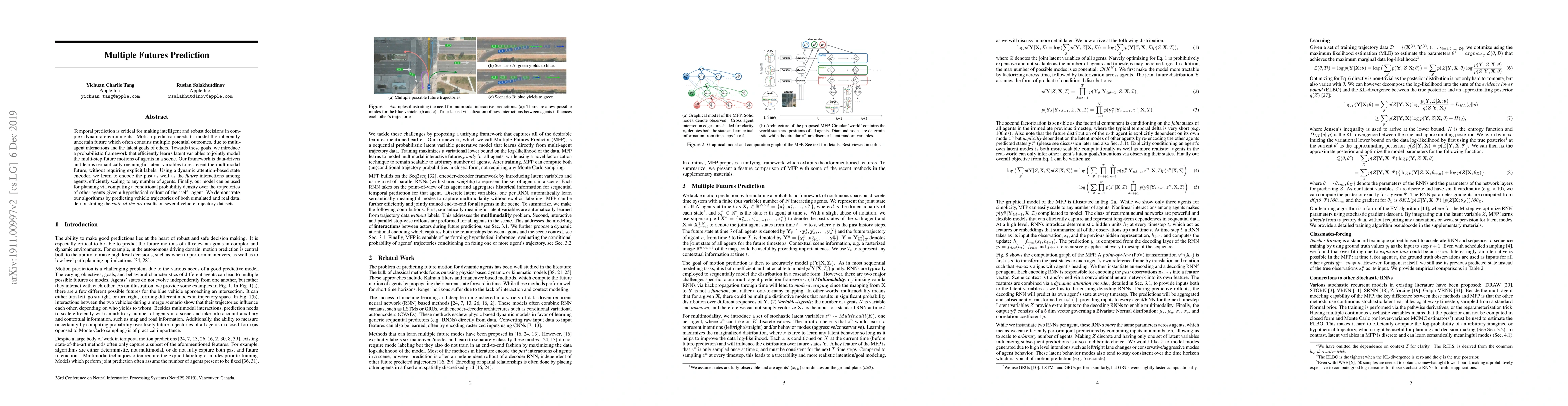 Temporal prediction is critical for making intelligent and robust decisions in complex dynamic environments. Motion prediction needs to model the inherently uncertain future which often contains multiple potential outcomes, due to multi-agent interactions and the latent goals of others. Towards these goals, we introduce a probabilistic framework that efficiently learns latent variables to jointly model the multi-step future motions of agents in a scene. Our framework is data-driven and learns semantically meaningful latent variables to represent the multimodal future, without requiring explicit labels. Using a dynamic attention-based state encoder, we learn to encode the past as well as the future interactions among agents, efficiently scaling to any number of agents. Finally, our model can be used for planning via computing a conditional probability density over the trajectories of other agents given a hypothetical rollout of the 'self' agent. We demonstrate our algorithms by predicting vehicle trajectories of both simulated and real data, demonstrating the state-of-the-art results on several vehicle trajectory datasets.