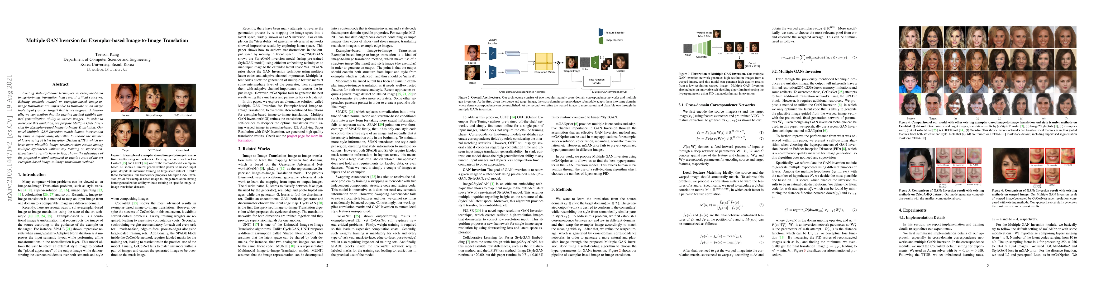 This paper proposes Multiple GAN Inversion for exemplar-based image-to-image translation to address limitations in existing methods, such as misalignment and limited generalization. The new approach selects optimal layers automatically using FID, achieving superior results without human intervention or additional training.