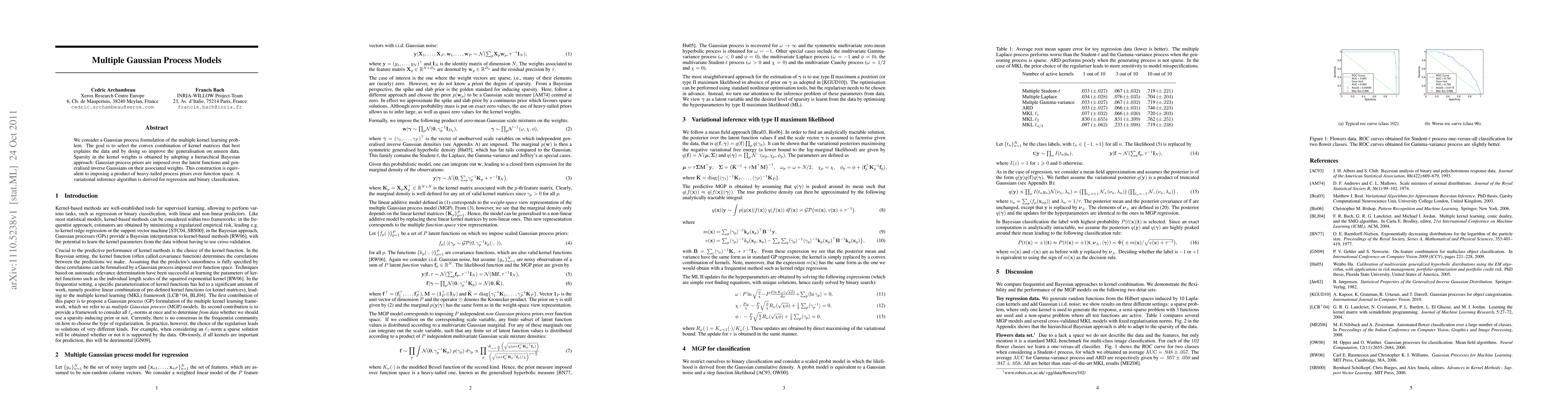 We consider a Gaussian process formulation of the multiple kernel learning problem. The goal is to select the convex combination of kernel matrices that best explains the data and by doing so improve the generalisation on unseen data. Sparsity in the kernel weights is obtained by adopting a hierarchical Bayesian approach: Gaussian process priors are imposed over the latent functions and generalised inverse Gaussians on their associated weights. This construction is equivalent to imposing a product of heavy-tailed process priors over function space. A variational inference algorithm is derived for regression and binary classification.