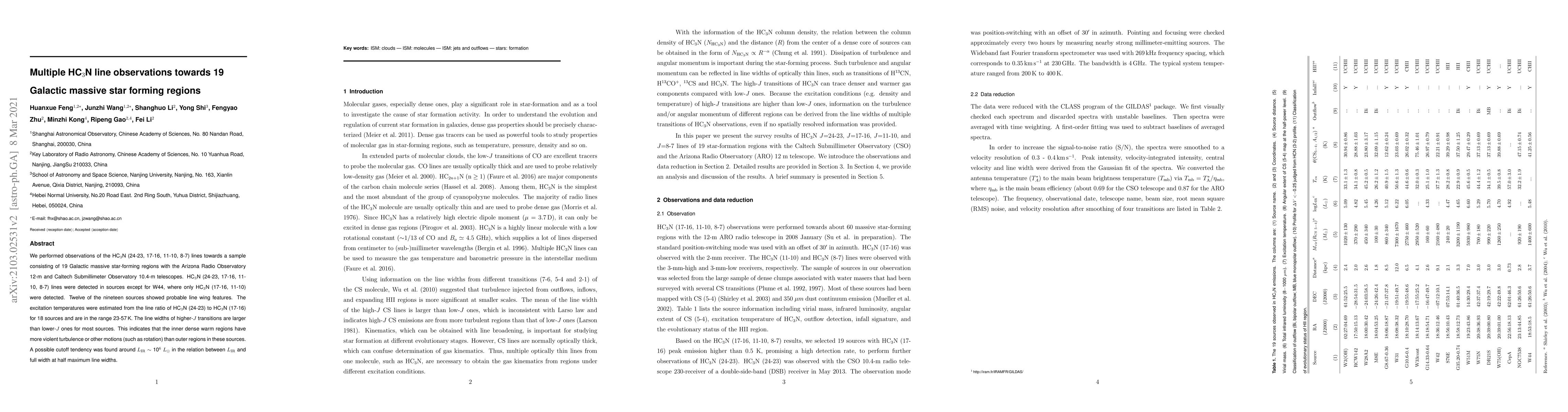 Researchers observed HC$_3$N lines in 19 Galactic massive star-forming regions, finding that inner dense warm regions have more turbulent motions than outer regions.