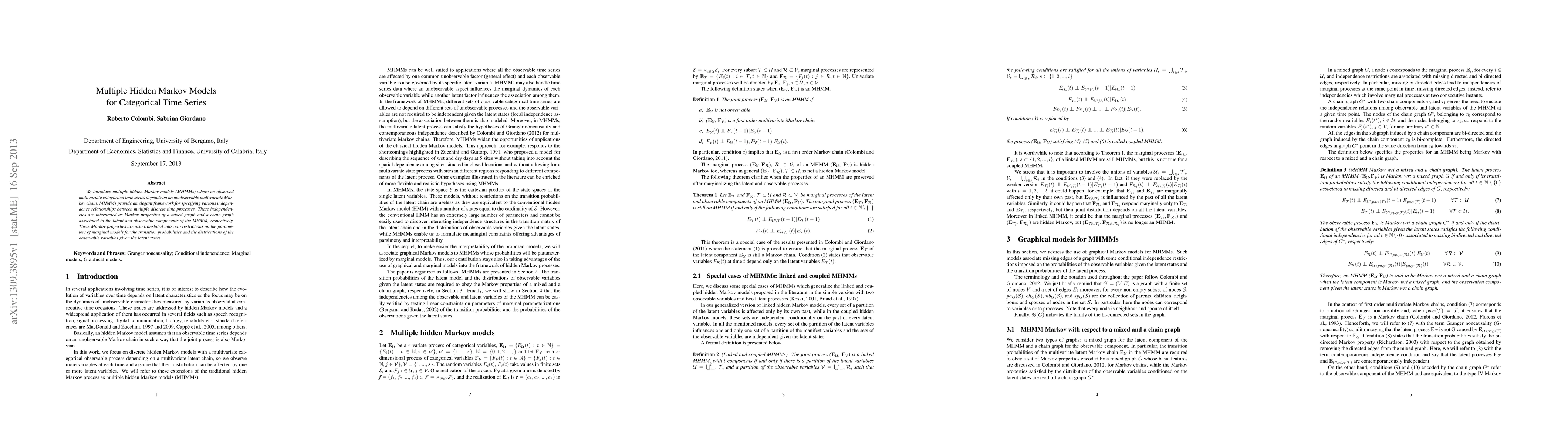 This paper introduces multiple hidden Markov models (MHMMs) for analyzing multivariate categorical time series, where observed data depends on an unobservable Markov chain. MHMMs specify various independence relationships between discrete time processes, interpreted through Markov properties of mixed and chain graphs, and translated into zero restrictions on model parameters.