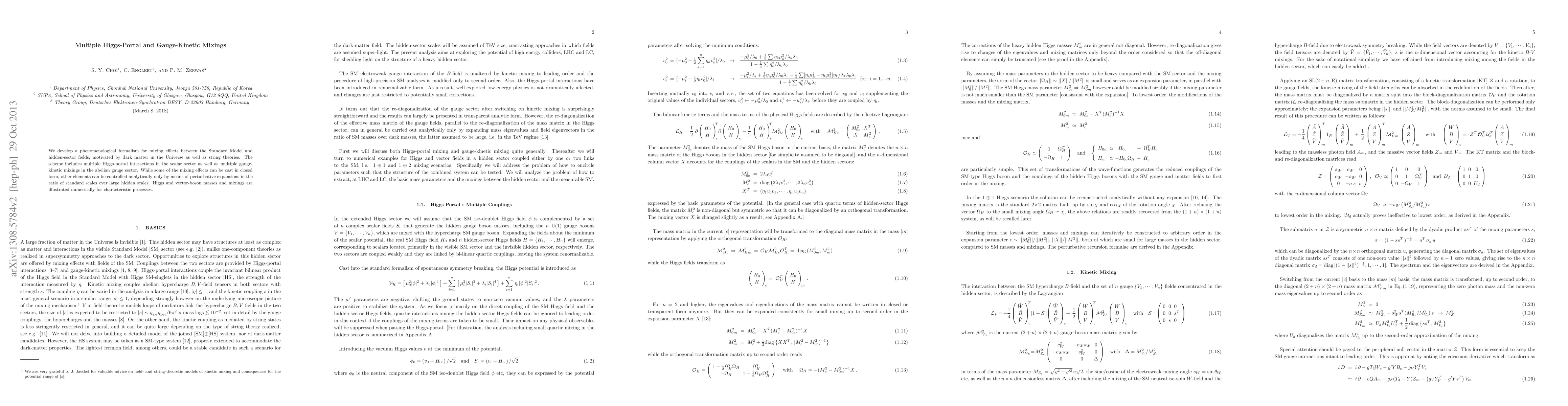 We develop a phenomenological formalism for mixing effects between the Standard Model and hidden-sector fields, motivated by dark matter in the Universe as well as string theories. The scheme includes multiple Higgs-portal interactions in the scalar sector as well as multiple gauge-kinetic mixings in the abelian gauge sector. While some of the mixing effects can be cast in closed form, other elements can be controlled analytically only by means of perturbative expansions in the ratio of standard scales over large hidden scales. Higgs and vector-boson masses and mixings are illustrated numerically for characteristic processes.