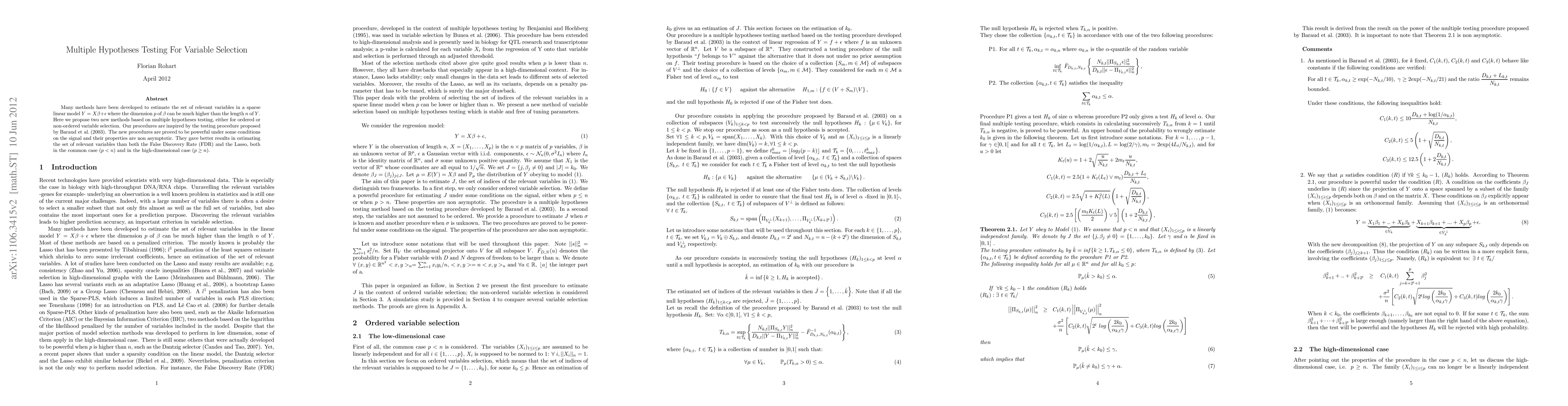 The paper proposes new methods for variable selection in sparse linear models using multiple hypotheses testing, applicable for both ordered and non-ordered variables. These methods are based on non-asymptotic theorems and are compared against existing techniques like FDR and Lasso.