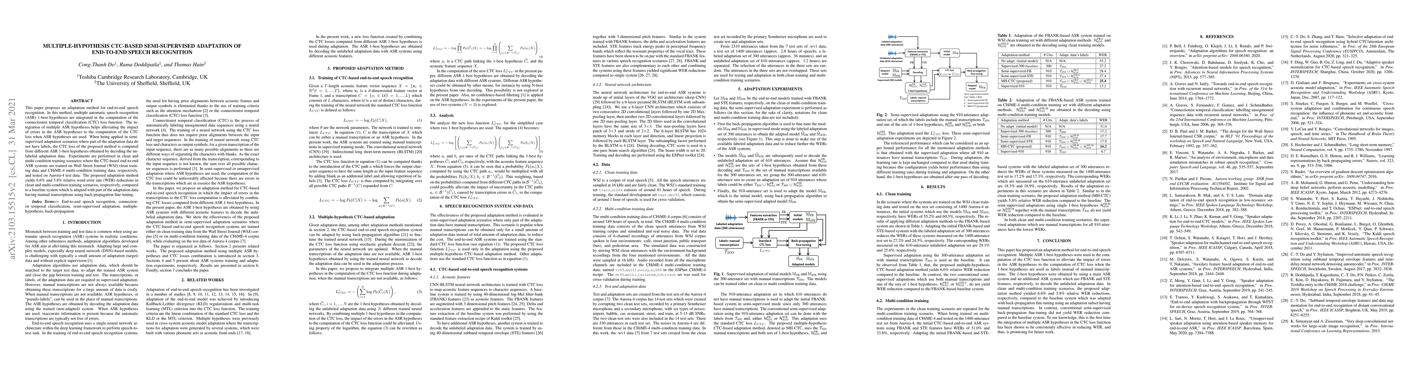 This paper proposes an adaptation method for end-to-end speech recognition that integrates multiple ASR hypotheses into the CTC loss function, achieving significant reductions in word error rates in both clean and multi-condition training scenarios. The method shows a 6.6% and 5.8% relative WER reduction in clean and multi-condition settings, respectively, compared to a baseline system.