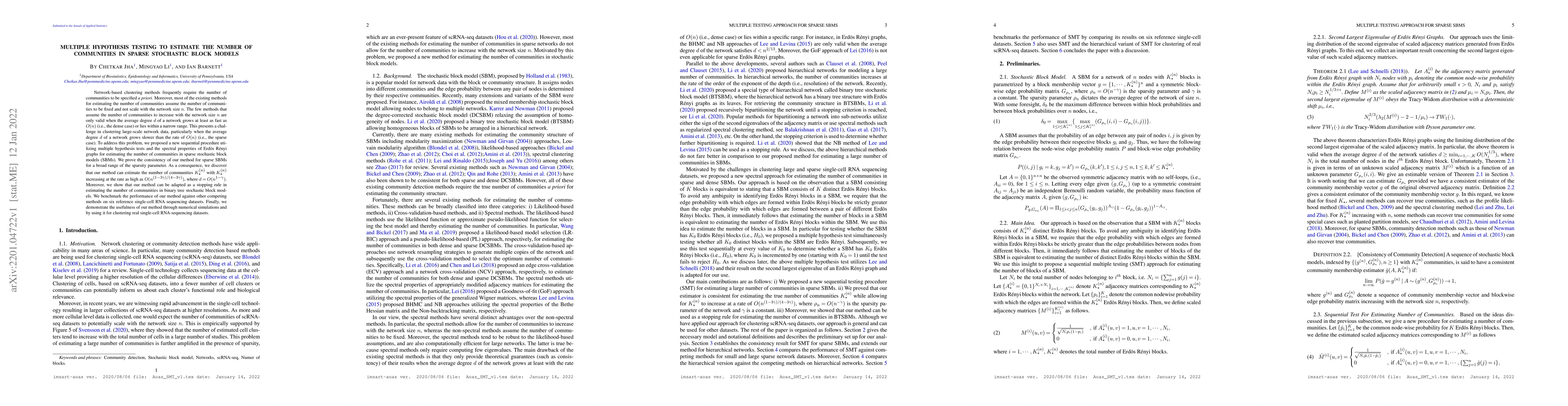 This paper proposes a new sequential procedure using multiple hypothesis tests to estimate the number of communities in sparse stochastic block models, addressing the challenge of scaling community detection in large networks where average degree grows slower than linear. The method is shown to be consistent and adaptable, and its performance is benchmarked against other methods on single-cell RNA sequencing datasets.