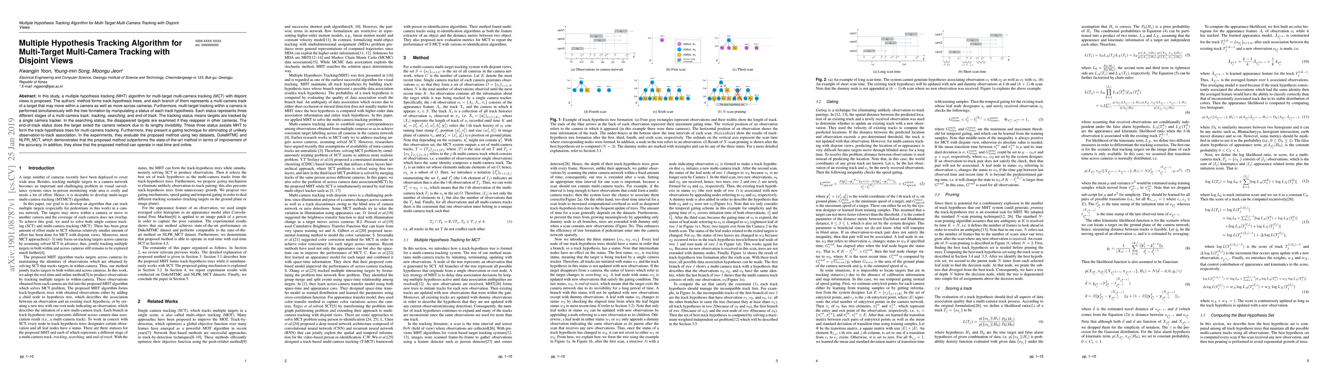 This paper proposes a multiple hypothesis tracking (MHT) algorithm for multi-target tracking across multiple cameras with disjoint views. The method uses track-hypothesis trees to manage targets that move within and between cameras, incorporating three statuses: tracking, searching, and end-of-track. Experimental results on DukeMTMC and NLPR-MCT datasets show improved accuracy and real-time operation compared to state-of-the-art methods.
