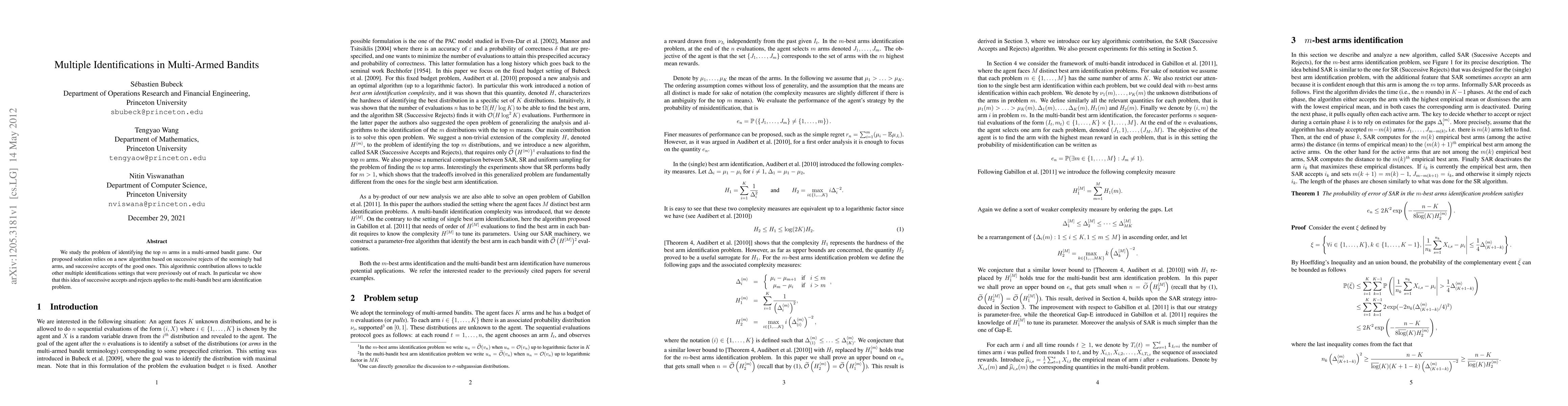 We study the problem of identifying the top $m$ arms in a multi-armed bandit game. Our proposed solution relies on a new algorithm based on successive rejects of the seemingly bad arms, and successive accepts of the good ones. This algorithmic contribution allows to tackle other multiple identifications settings that were previously out of reach. In particular we show that this idea of successive accepts and rejects applies to the multi-bandit best arm identification problem.