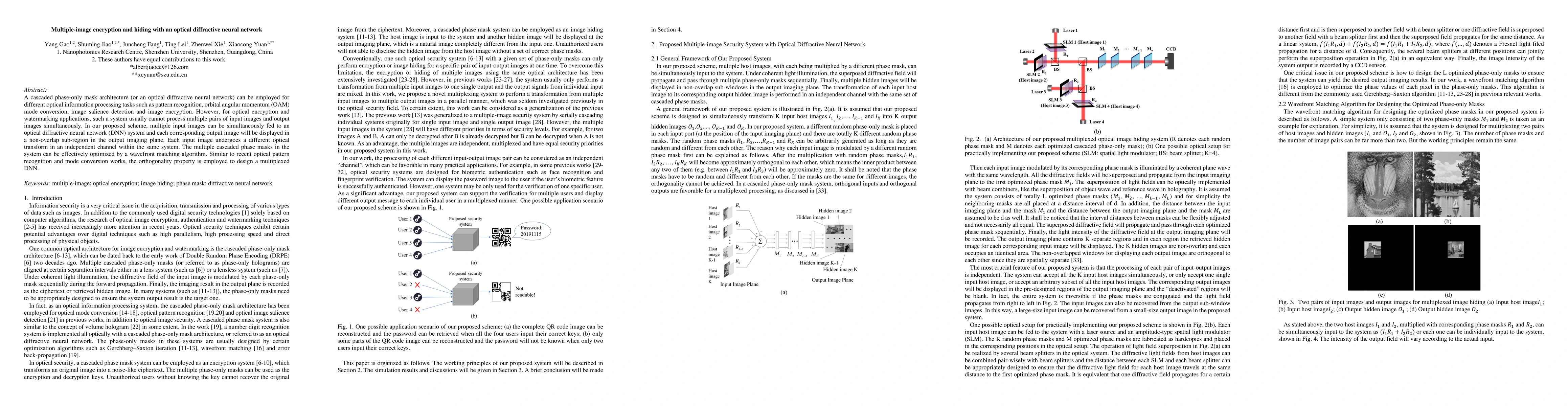 A cascaded phase-only mask architecture (or an optical diffractive neural network) can be employed for different optical information processing tasks such as pattern recognition, orbital angular momentum (OAM) mode conversion, image salience detection and image encryption. However, for optical encryption and watermarking applications, such a system usually cannot process multiple pairs of input images and output images simultaneously. In our proposed scheme, multiple input images can be simultaneously fed to an optical diffractive neural network (DNN) system and each corresponding output image will be displayed in a non-overlap sub-region in the output imaging plane. Each input image undergoes a different optical transform in an independent channel within the same system. The multiple cascaded phase masks in the system can be effectively optimized by a wavefront matching algorithm. Similar to recent optical pattern recognition and mode conversion works, the orthogonality property is employed to design a multiplexed DNN.