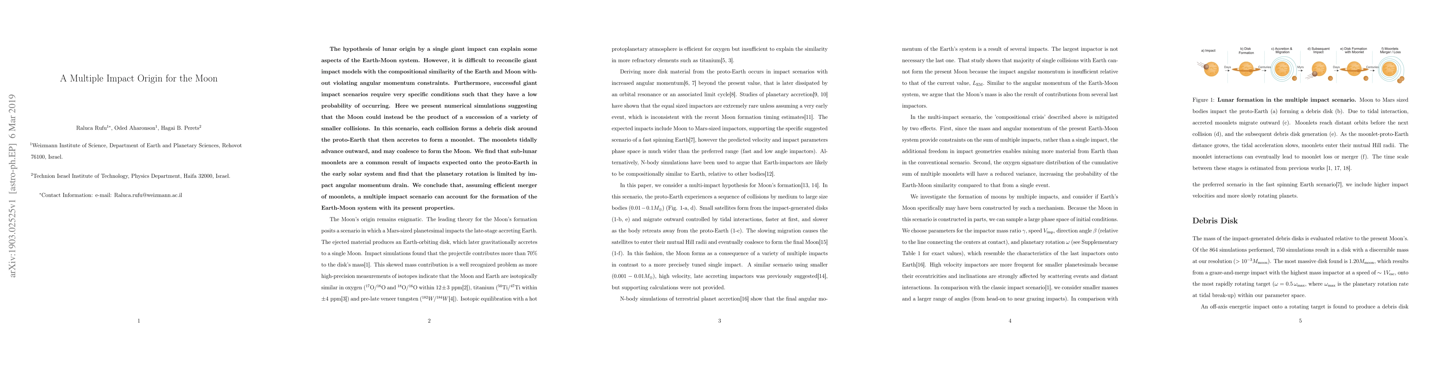 This paper proposes that the Moon's formation is better explained by a series of smaller impacts rather than a single giant impact, suggesting that moonlets formed from these collisions coalesced to create the Moon, addressing compositional and angular momentum issues.