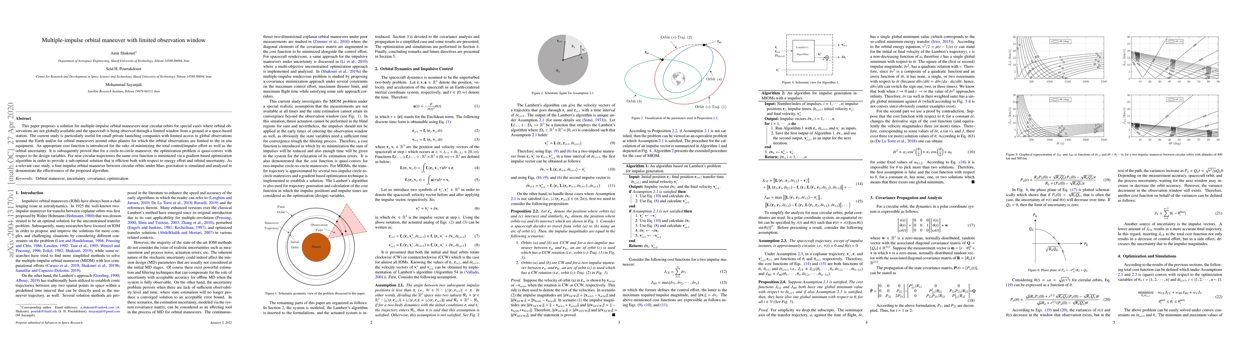 This paper proposes a solution for multiple-impulse orbital maneuvers near circular orbits for special cases where orbital observations are not globally available and the spacecraft is being observed through a limited window from a ground or a space-based station. The current study is particularly useful for small private launching companies with limited access to global observations around the Earth and/or for orbital maneuvers around other planets for which the orbital observations are limited to the in situ equipment. An appropriate cost function is introduced for the sake of minimizing the total control/impulse effort as well as the orbital uncertainty. It is subsequently proved that for a circle-to-circle maneuver, the optimization problem is quasi-convex with respect to the design variables. For near circular trajectories the same cost function is minimized via a gradient based optimization algorithm in order to provide a sub-optimal solution that is efficient both with respect to energy effort and orbital uncertainty. As a relevant case study, a four-impulse orbital maneuver between circular orbits under Mars gravitation is simulated and analyzed to demonstrate the effectiveness of the proposed algorithm.