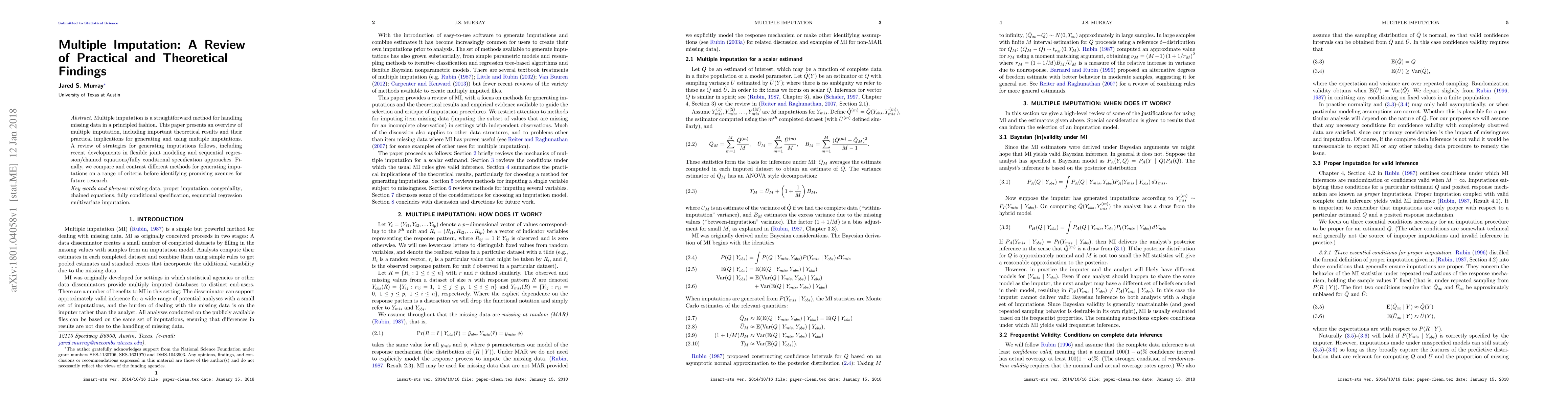 This paper reviews multiple imputation methods for handling missing data, highlighting theoretical results and practical implications. It examines various strategies for generating imputations, including recent advancements in joint modeling and sequential regression approaches, and identifies promising future research directions.