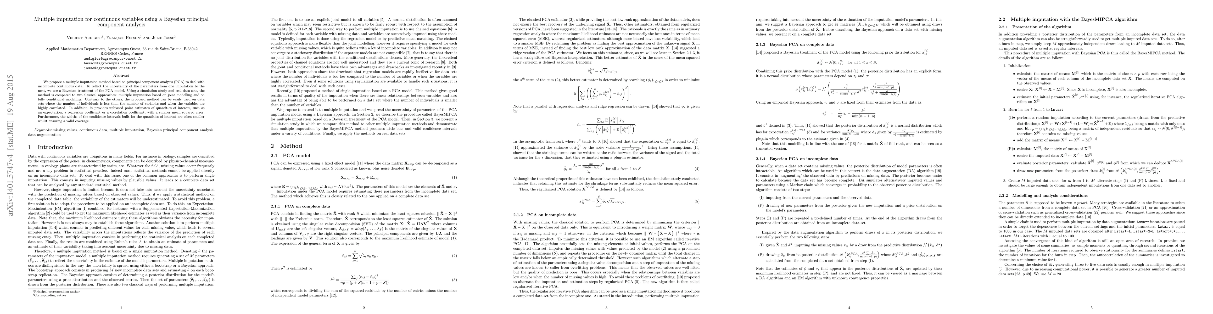 This paper proposes a Bayesian PCA-based multiple imputation method for handling incomplete continuous data, demonstrating its effectiveness through simulations and real datasets. Unlike traditional methods, it performs well with fewer individuals than variables and highly correlated data, yielding more accurate and precise estimates.