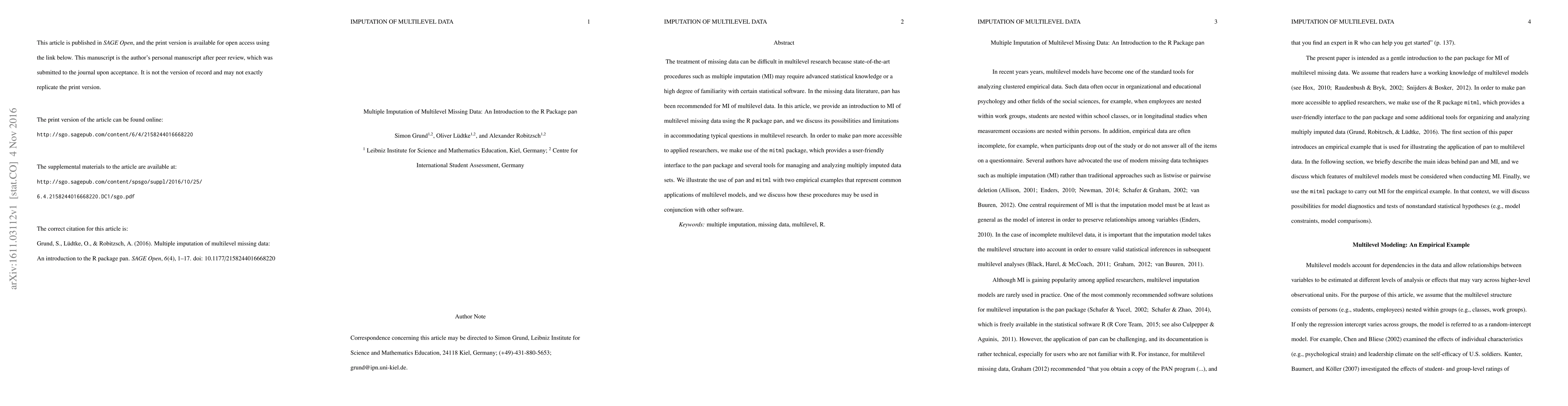 This paper introduces the R package pan for multiple imputation of multilevel missing data, emphasizing its accessibility through the mitml package. It provides practical examples and discusses the package's capabilities and limitations for applied researchers in multilevel research.
