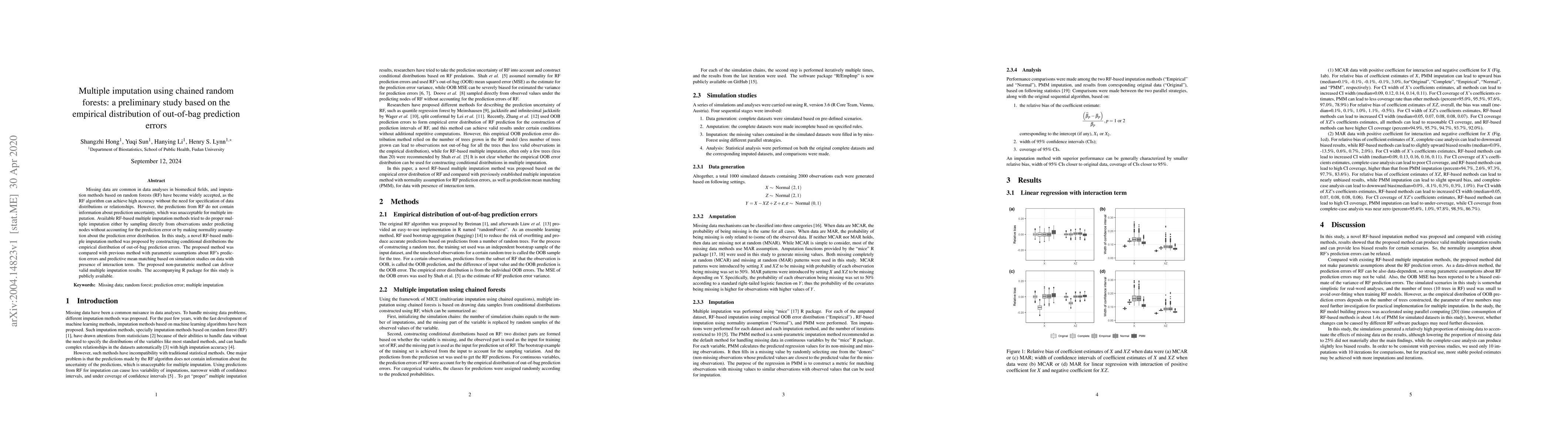 This study proposes a novel multiple imputation method using chained random forests based on the empirical distribution of out-of-bag prediction errors, addressing the lack of prediction uncertainty in traditional RF methods. The proposed non-parametric approach was shown to deliver valid imputation results compared to parametric methods in simulation studies.