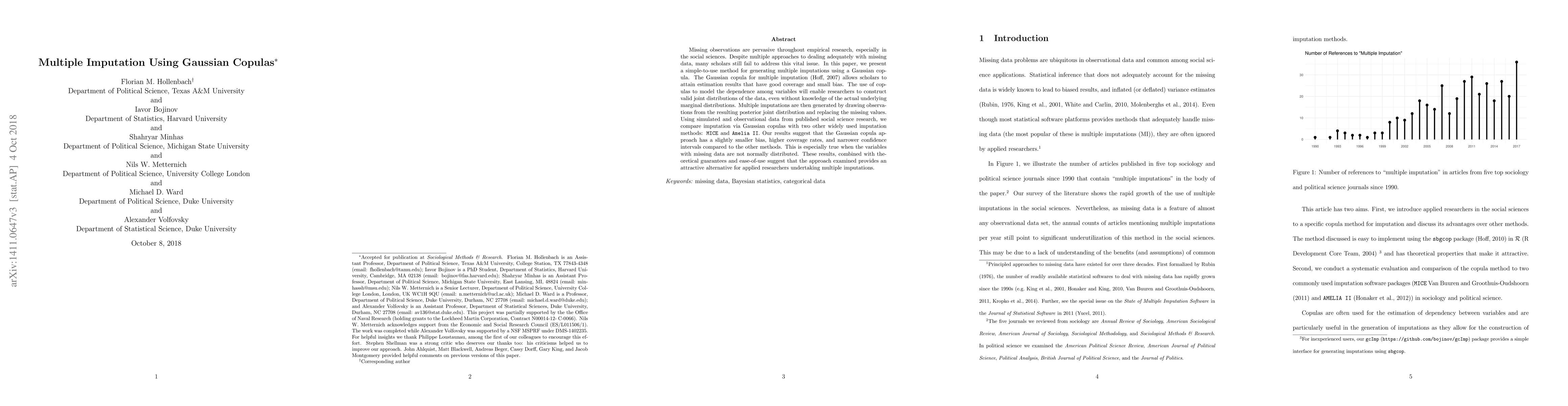 This paper presents a Gaussian copula method for multiple imputation to address missing data in social sciences, showing it has slightly smaller bias, higher coverage rates, and narrower confidence intervals compared to MICE and Amelia II, especially for non-normally distributed variables. The method's theoretical guarantees and ease-of-use make it a promising alternative for researchers.