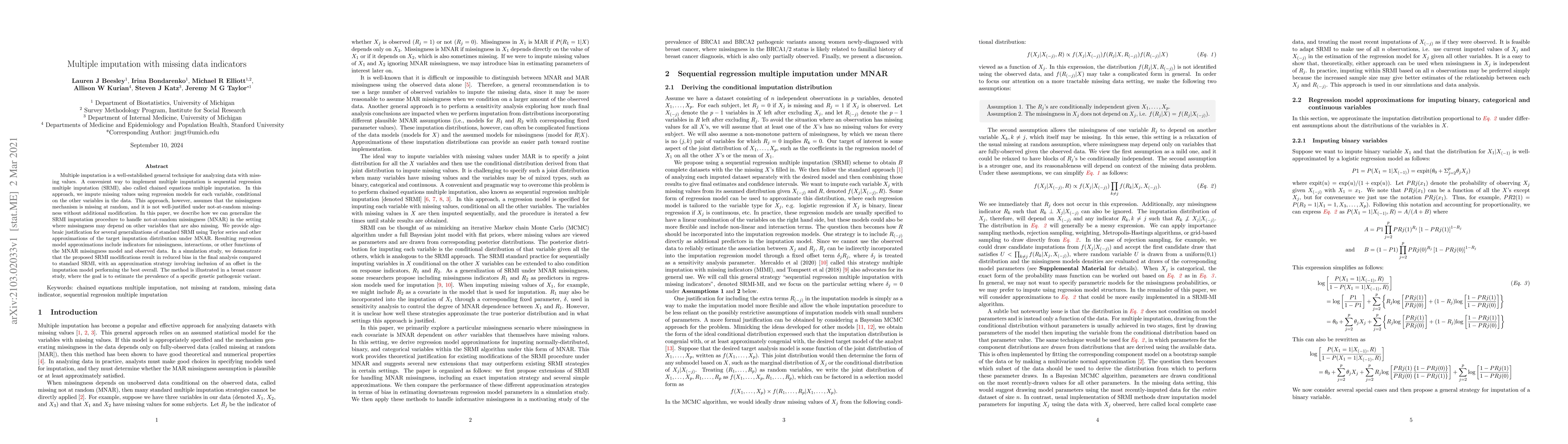 This paper proposes a generalized sequential regression multiple imputation (SRMI) method to handle missing not at random (MNAR) data by incorporating missing data indicators and interactions into the imputation model. The method shows reduced bias in simulations and is demonstrated in a breast cancer study estimating genetic variant prevalence.