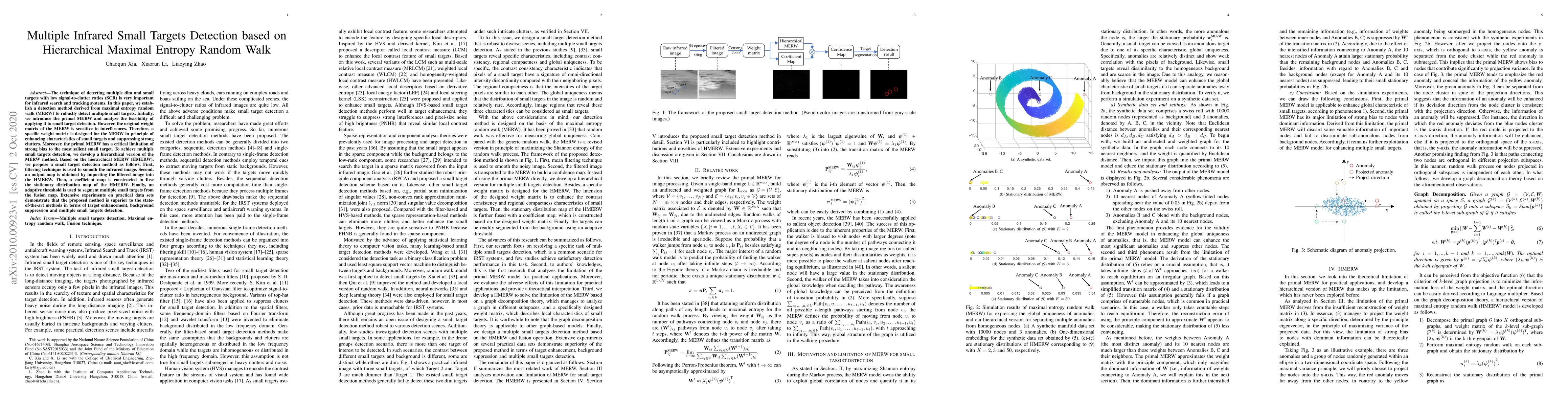 This paper proposes a hierarchical maximal entropy random walk (HMERW) method for detecting multiple dim and small infrared targets with low signal-to-clutter ratios. The method enhances small target characteristics and suppresses strong clutters by designing a specific weight matrix, and it mitigates bias towards the most salient target by employing a hierarchical approach, achieving superior detection performance compared to existing methods.
