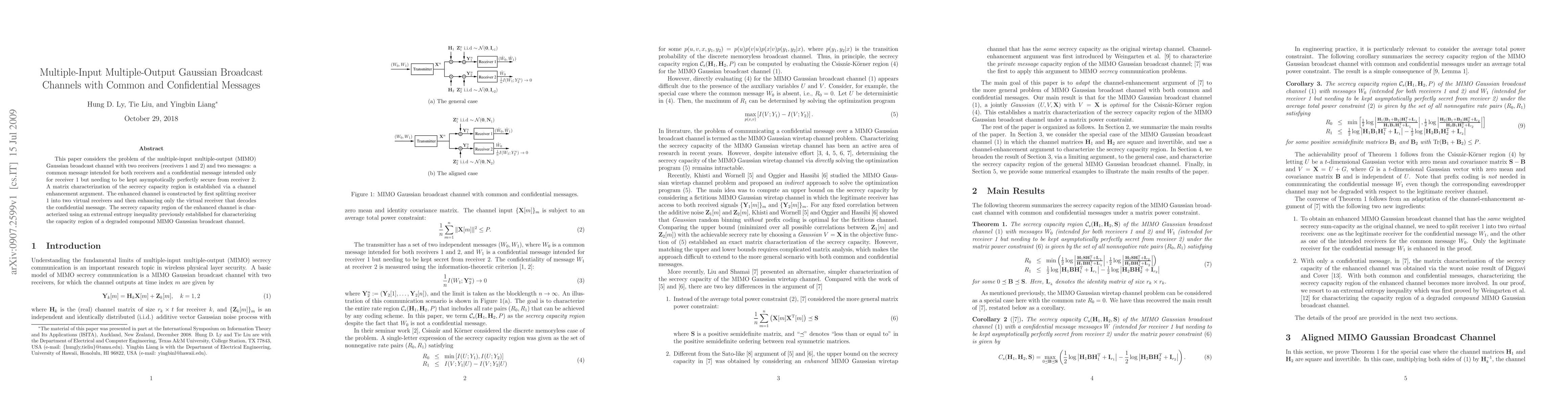 This paper considers the problem of the multiple-input multiple-output (MIMO) Gaussian broadcast channel with two receivers (receivers 1 and 2) and two messages: a common message intended for both receivers and a confidential message intended only for receiver 1 but needing to be kept asymptotically perfectly secure from receiver 2. A matrix characterization of the secrecy capacity region is established via a channel enhancement argument. The enhanced channel is constructed by first splitting receiver 1 into two virtual receivers and then enhancing only the virtual receiver that decodes the confidential message. The secrecy capacity region of the enhanced channel is characterized using an extremal entropy inequality previously established for characterizing the capacity region of a degraded compound MIMO Gaussian broadcast channel.