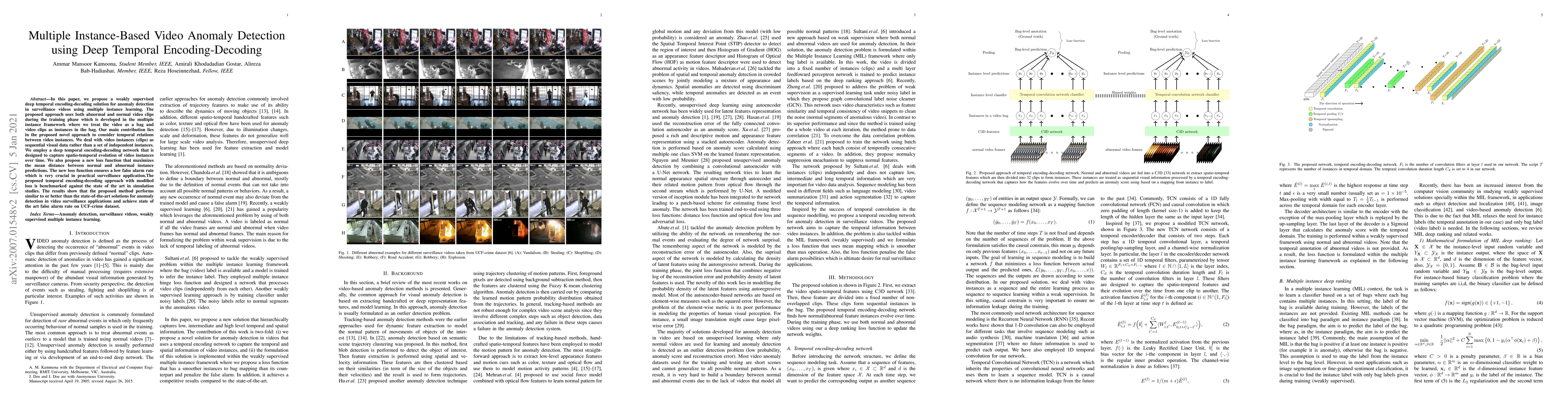 In this paper, we propose a weakly supervised deep temporal encoding-decoding solution for anomaly detection in surveillance videos using multiple instance learning. The proposed approach uses both abnormal and normal video clips during the training phase which is developed in the multiple instance framework where we treat video as a bag and video clips as instances in the bag. Our main contribution lies in the proposed novel approach to consider temporal relations between video instances. We deal with video instances (clips) as a sequential visual data rather than independent instances. We employ a deep temporal and encoder network that is designed to capture spatial-temporal evolution of video instances over time. We also propose a new loss function that is smoother than similar loss functions recently presented in the computer vision literature, and therefore; enjoys faster convergence and improved tolerance to local minima during the training phase. The proposed temporal encoding-decoding approach with modified loss is benchmarked against the state-of-the-art in simulation studies. The results show that the proposed method performs similar to or better than the state-of-the-art solutions for anomaly detection in video surveillance applications.