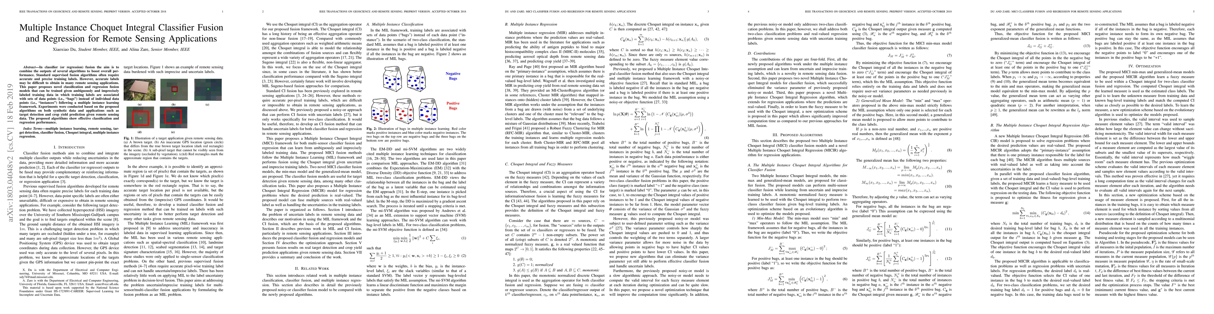 In classifier (or regression) fusion the aim is to combine the outputs of several algorithms to boost overall performance. Standard supervised fusion algorithms often require accurate and precise training labels. However, accurate labels may be difficult to obtain in many remote sensing applications. This paper proposes novel classification and regression fusion models that can be trained given ambiguosly and imprecisely labeled training data in which training labels are associated with sets of data points (i.e., "bags") instead of individual data points (i.e., "instances") following a multiple instance learning framework. Experiments were conducted based on the proposed algorithms on both synthetic data and applications such as target detection and crop yield prediction given remote sensing data. The proposed algorithms show effective classification and regression performance.