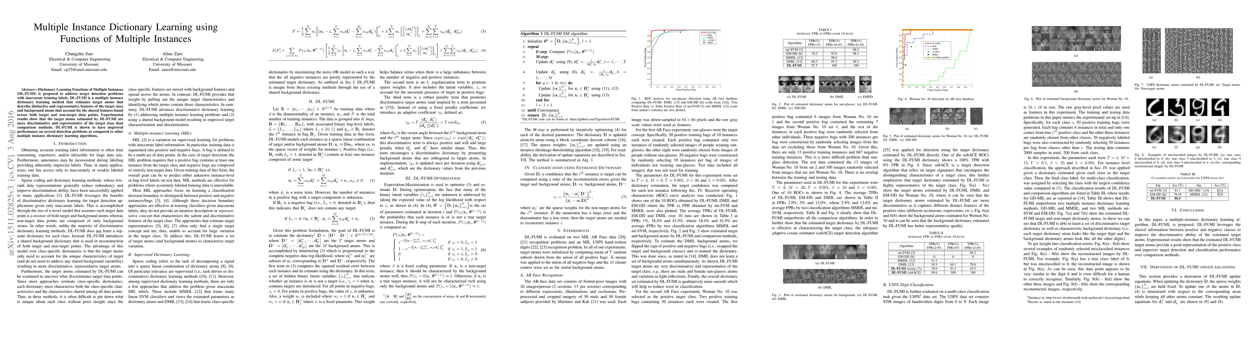 This paper proposes a multiple instance dictionary learning method (DL-FUMI) that uses functions of multiple instances to tackle target detection and two-class classification with inaccurate training labels. DL-FUMI outperforms existing methods by learning more representative dictionary atoms for the true positive class and achieving better performance on multiple instance learning problems.