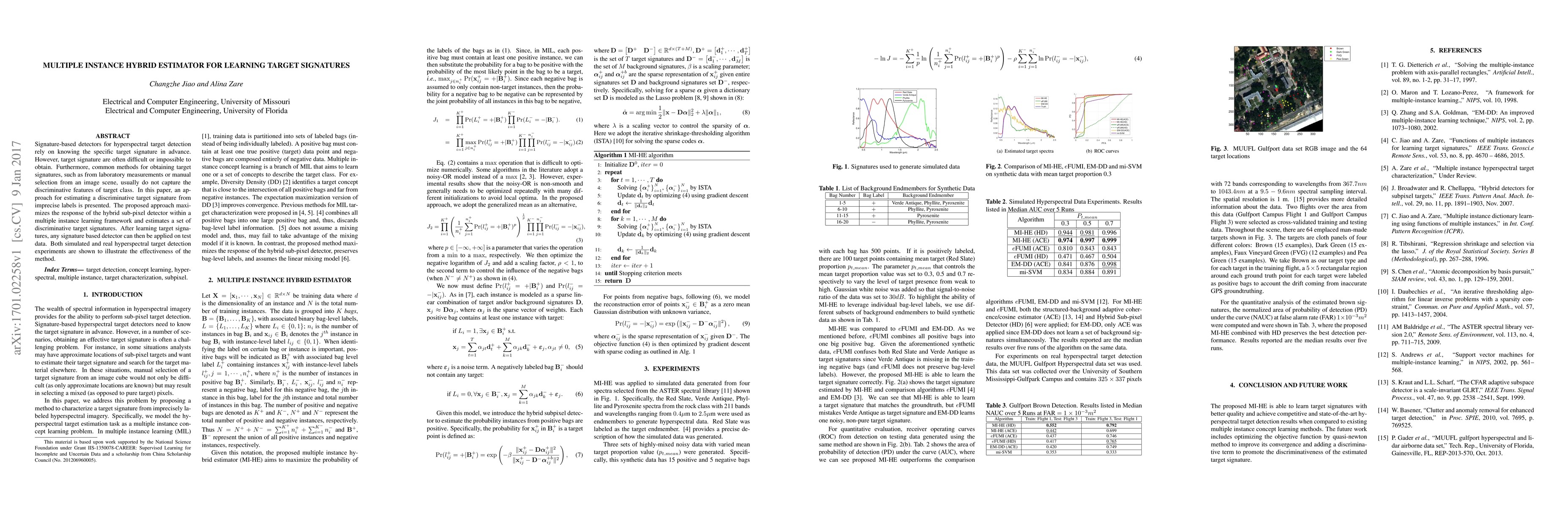 This paper proposes a hybrid estimator for learning target signatures in hyperspectral target detection using a multiple instance learning framework. The method estimates discriminative target signatures from imprecise labels, enhancing the performance of subsequent signature-based detectors, as demonstrated through both simulated and real hyperspectral data experiments.