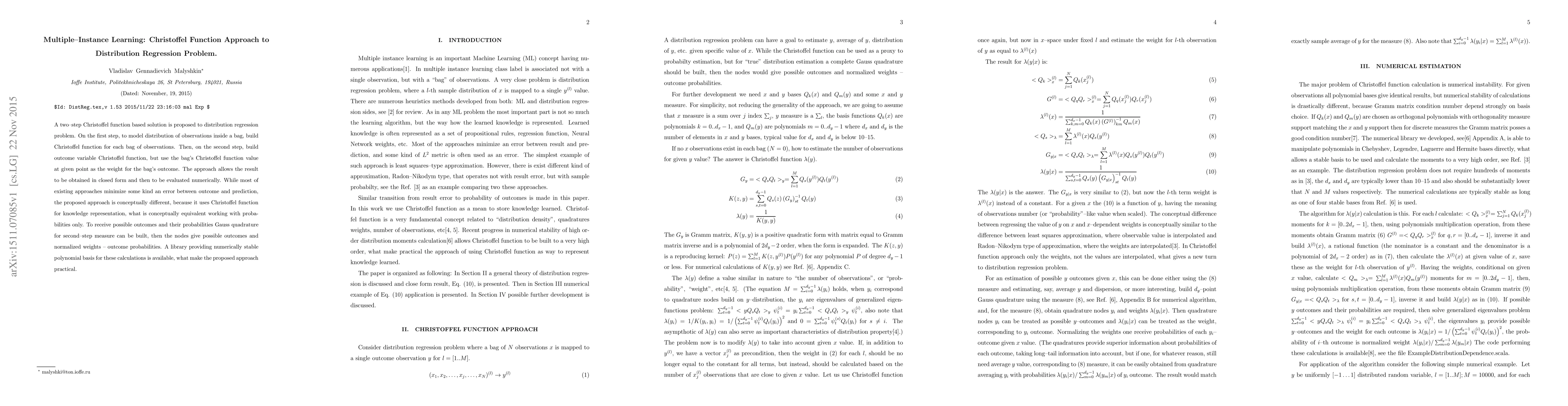 A two--step Christoffel function based solution is proposed to distribution regression problem. On the first step, to model distribution of observations inside a bag, build Christoffel function for each bag of observations. Then, on the second step, build outcome variable Christoffel function, but use the bag's Christoffel function value at given point as the weight for the bag's outcome. The approach allows the result to be obtained in closed form and then to be evaluated numerically. While most of existing approaches minimize some kind an error between outcome and prediction, the proposed approach is conceptually different, because it uses Christoffel function for knowledge representation, what is conceptually equivalent working with probabilities only. To receive possible outcomes and their probabilities Gauss quadrature for second--step measure can be built, then the nodes give possible outcomes and normalized weights -- outcome probabilities. A library providing numerically stable polynomial basis for these calculations is available, what make the proposed approach practical.