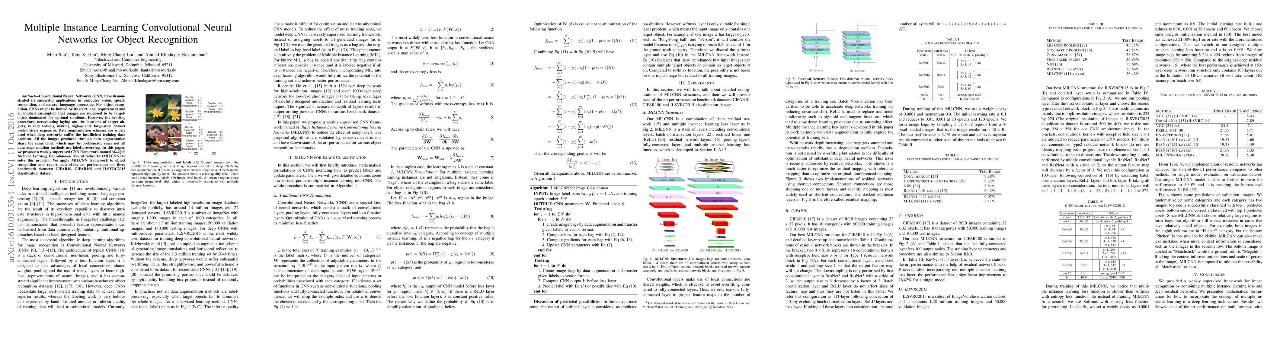 This paper proposes a Multiple Instance Learning Convolutional Neural Network (MILCNN) framework for object recognition, addressing the limitations of traditional CNNs in weakly supervised settings. The approach achieves state-of-the-art performance on CIFAR10, CIFAR100, and ILSVRC2015 datasets by effectively handling the challenges of labeling and data augmentation.