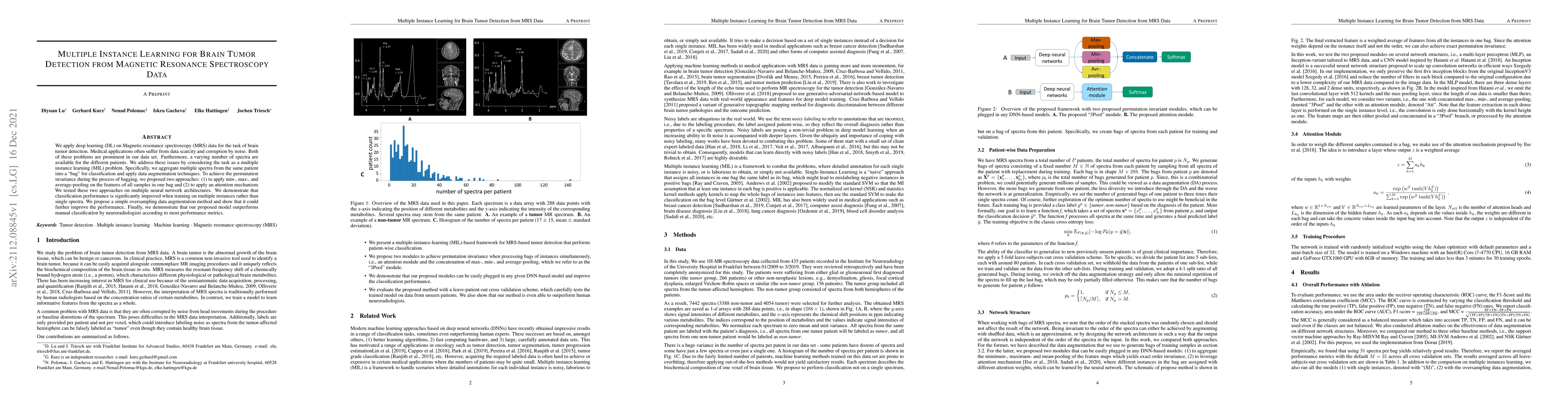 This research paper applies deep learning to Magnetic Resonance Spectroscopy data for brain tumor detection, improving performance with multiple instance learning and oversampling data augmentation methods.