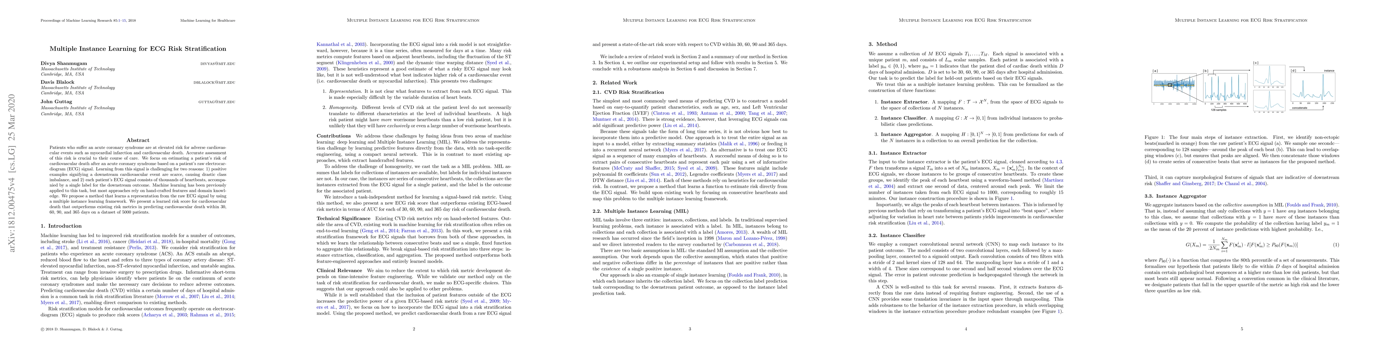 Patients who suffer an acute coronary syndrome are at elevated risk for adverse cardiovascular events such as myocardial infarction and cardiovascular death. Accurate assessment of this risk is crucial to their course of care. We focus on estimating a patient's risk of cardiovascular death after an acute coronary syndrome based on a patient's raw electrocardiogram (ECG) signal. Learning from this signal is challenging for two reasons: 1) positive examples signifying a downstream cardiovascular event are scarce, causing drastic class imbalance, and 2) each patient's ECG signal consists of thousands of heartbeats, accompanied by a single label for the downstream outcome. Machine learning has been previously applied to this task, but most approaches rely on hand-crafted features and domain knowledge. We propose a method that learns a representation from the raw ECG signal by using a multiple instance learning framework. We present a learned risk score for cardiovascular death that outperforms existing risk metrics in predicting cardiovascular death within 30, 60, 90, and 365 days on a dataset of 5000 patients.