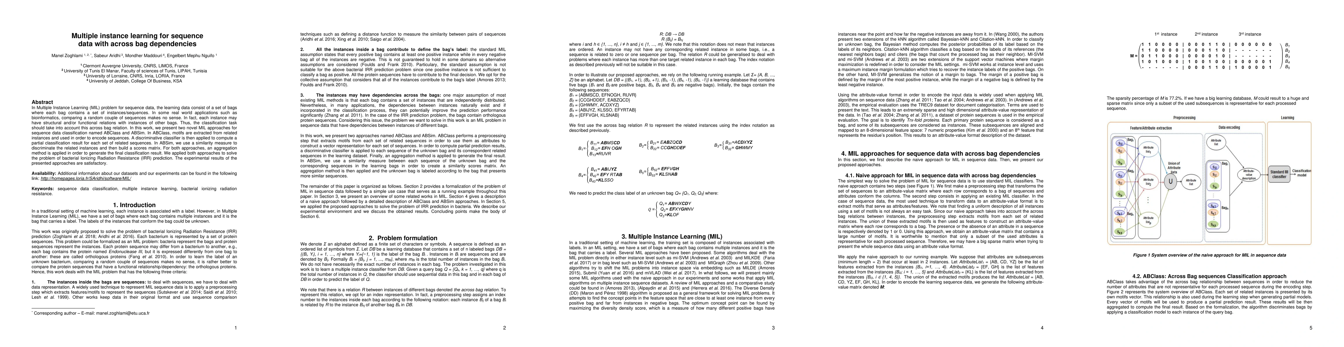 Two novel Multiple Instance Learning approaches (ABClass and ABSim) for sequence data classification were proposed to handle across-bag dependencies in real-world applications like bioinformatics, achieving satisfactory results in bacterial Ionizing Radiation Resistance prediction.