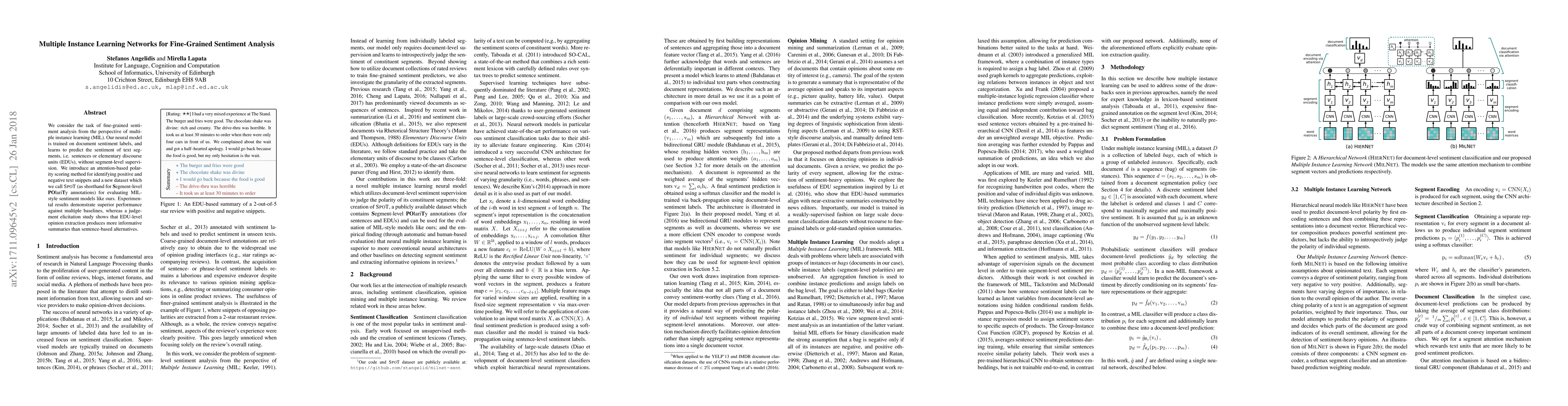 This paper proposes a multiple instance learning neural network for fine-grained sentiment analysis, trained without segment-level supervision, and introduces a new dataset, SPOT, for evaluation. The model outperforms baselines and generates more informative summaries by identifying sentiment at the EDU level.
