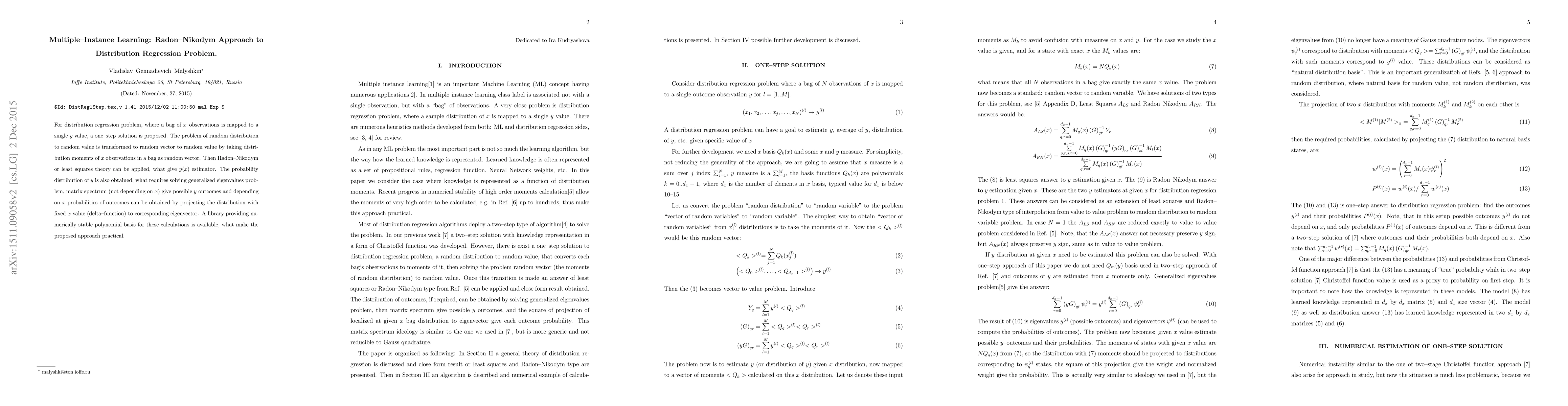 For distribution regression problem, where a bag of $x$--observations is mapped to a single $y$ value, a one--step solution is proposed. The problem of random distribution to random value is transformed to random vector to random value by taking distribution moments of $x$ observations in a bag as random vector. Then Radon--Nikodym or least squares theory can be applied, what give $y(x)$ estimator. The probability distribution of $y$ is also obtained, what requires solving generalized eigenvalues problem, matrix spectrum (not depending on $x$) give possible $y$ outcomes and depending on $x$ probabilities of outcomes can be obtained by projecting the distribution with fixed $x$ value (delta--function) to corresponding eigenvector. A library providing numerically stable polynomial basis for these calculations is available, what make the proposed approach practical.