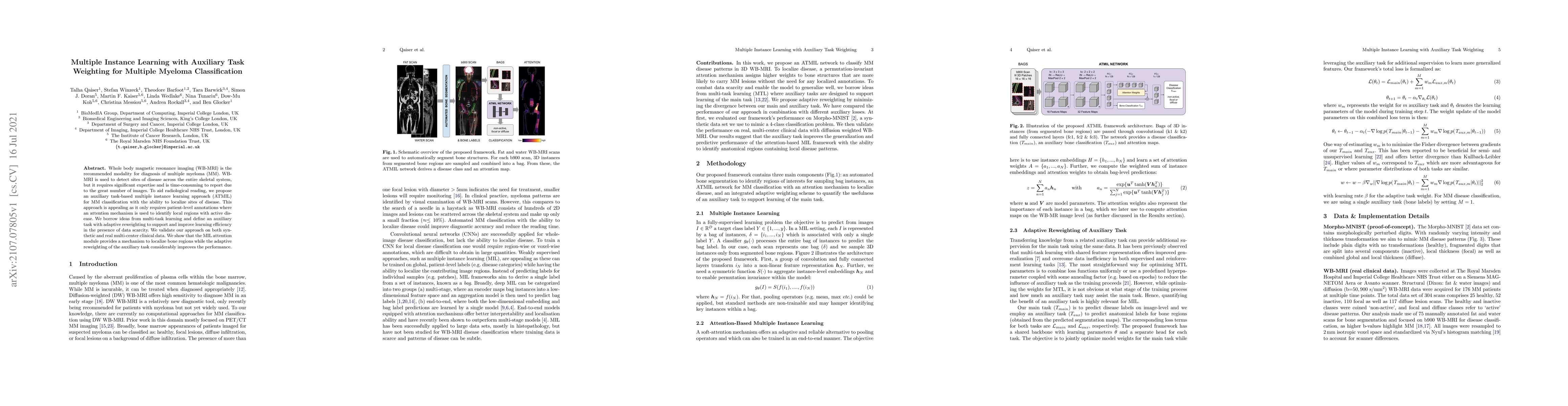 Whole body magnetic resonance imaging (WB-MRI) is the recommended modality for diagnosis of multiple myeloma (MM). WB-MRI is used to detect sites of disease across the entire skeletal system, but it requires significant expertise and is time-consuming to report due to the great number of images. To aid radiological reading, we propose an auxiliary task-based multiple instance learning approach (ATMIL) for MM classification with the ability to localize sites of disease. This approach is appealing as it only requires patient-level annotations where an attention mechanism is used to identify local regions with active disease. We borrow ideas from multi-task learning and define an auxiliary task with adaptive reweighting to support and improve learning efficiency in the presence of data scarcity. We validate our approach on both synthetic and real multi-center clinical data. We show that the MIL attention module provides a mechanism to localize bone regions while the adaptive reweighting of the auxiliary task considerably improves the performance.